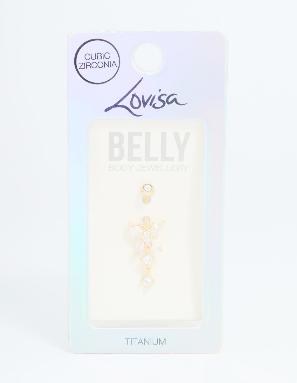 Gold Plated Titanium Cubic Zirconia Butterfly Belly Bar Gold Plated Titanium Cubic Zirconia Butterfly Belly Bar Gold Plated Titanium Cubic Zirconia Butterfly Belly Bar