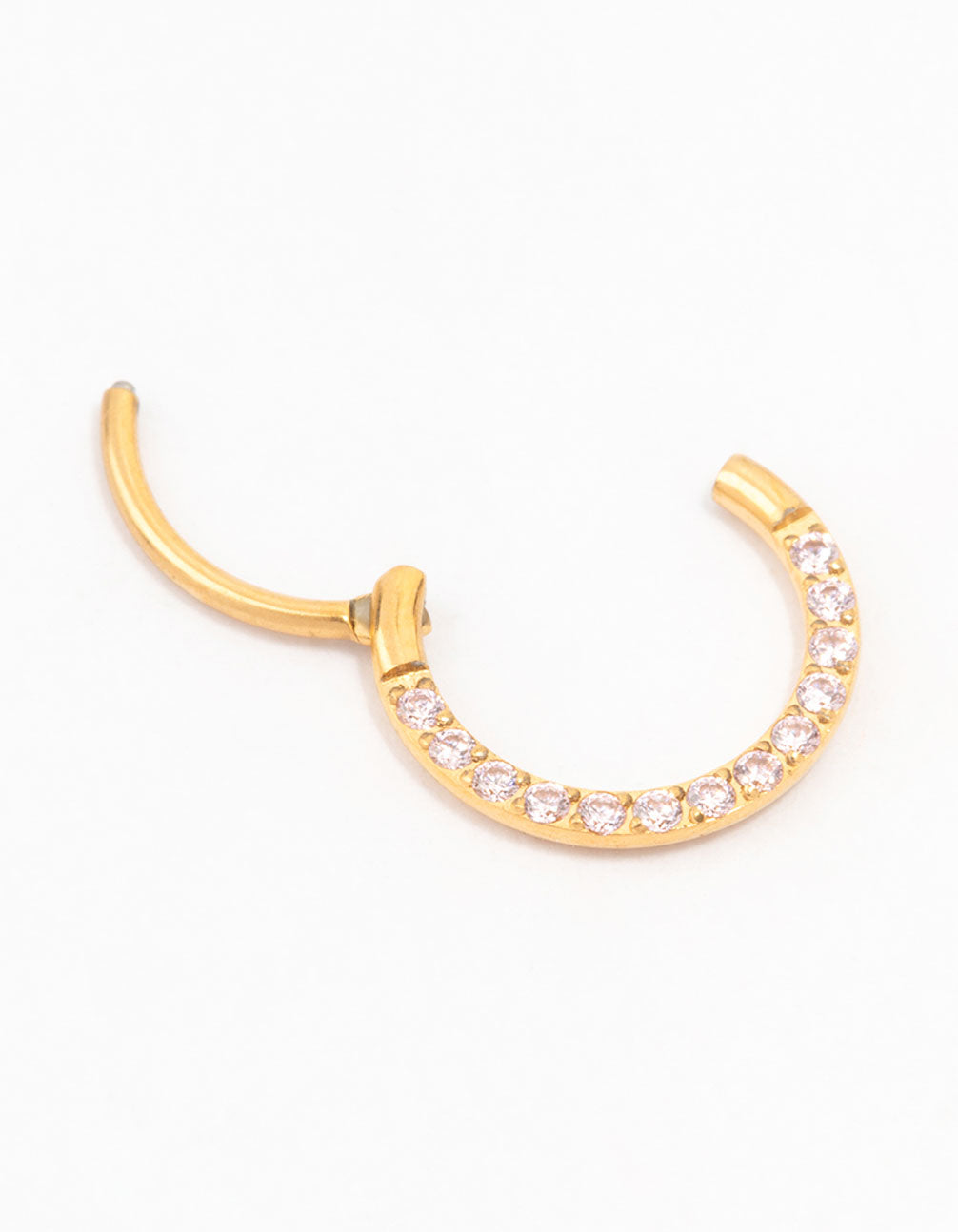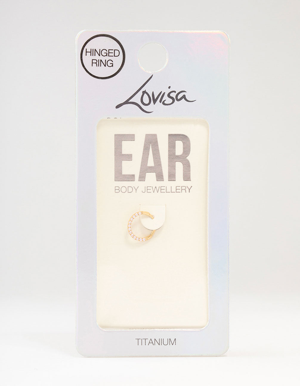 This versatile clicker ring, plated in gold titanium and adorned with dainty cubic zirconia crystals, adds a touch of glamour to any look. Ideal for ear piercings like the lobe, rook, helix, or even the septum.