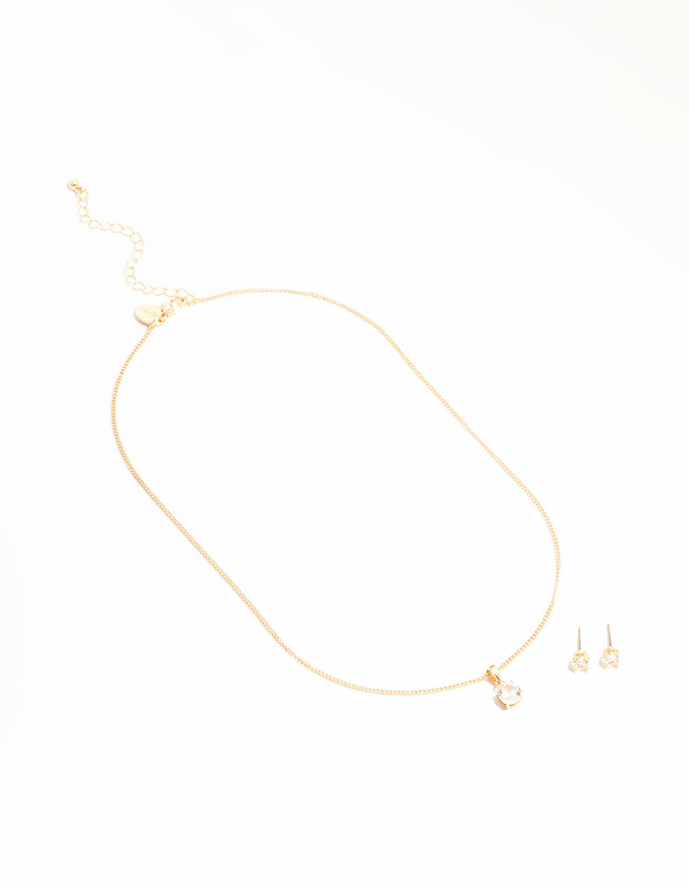 Gold Cubic Zirconia Solitaire Necklace & Stud Earrings Set