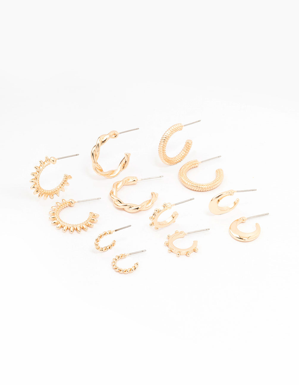 Introducing the ultimate earring pack for fashion-forward individuals who love a more edgy look! This set features six huggie earrings in a luxe gold finish in different designs like spikes, rope style, and ribbed textures for some funky flair.