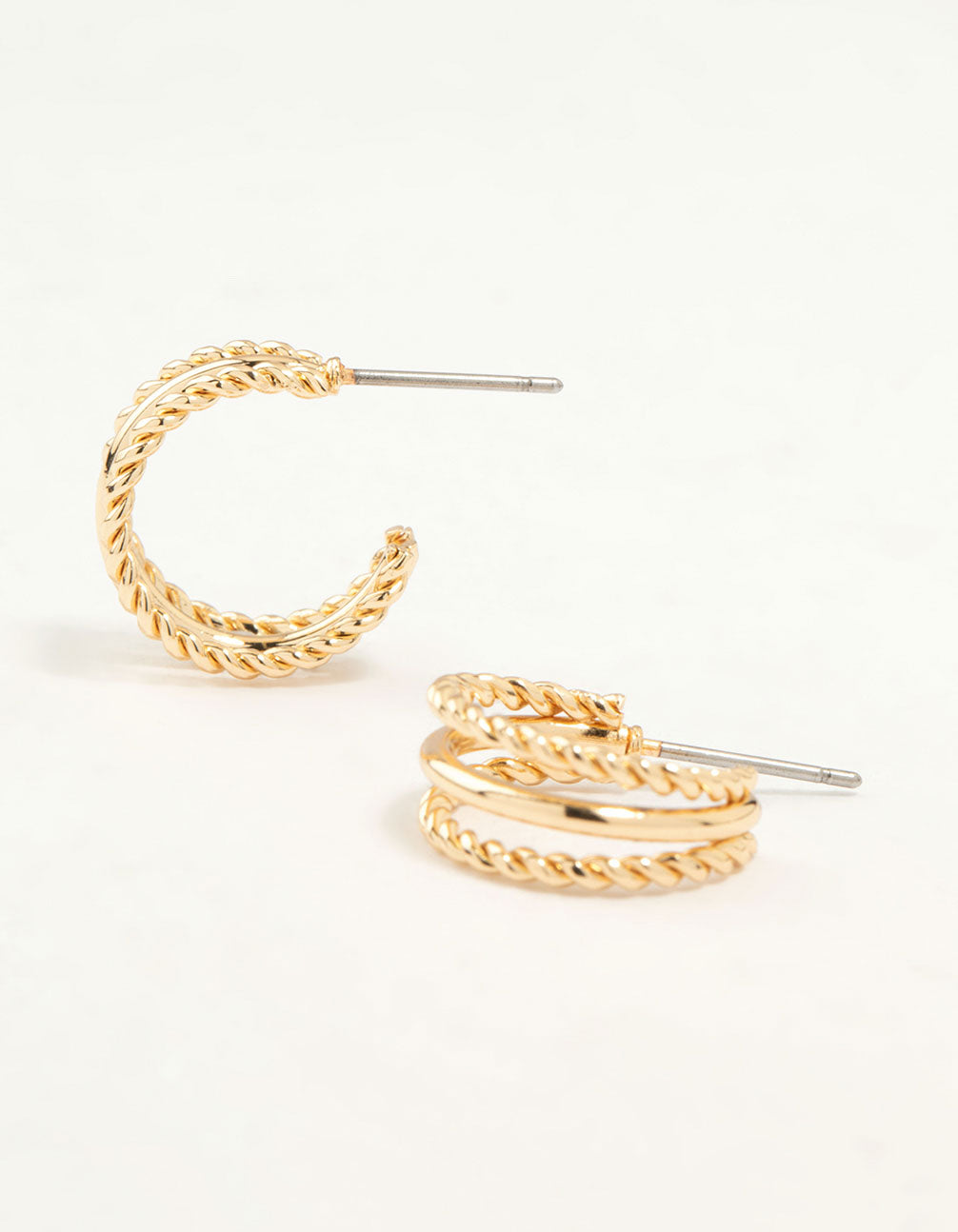 Add visual interest with these gold-toned huggie earrings! Featuring three layers—two twisted and one plain—they combine fun texture and sleekness in one stylish pair.