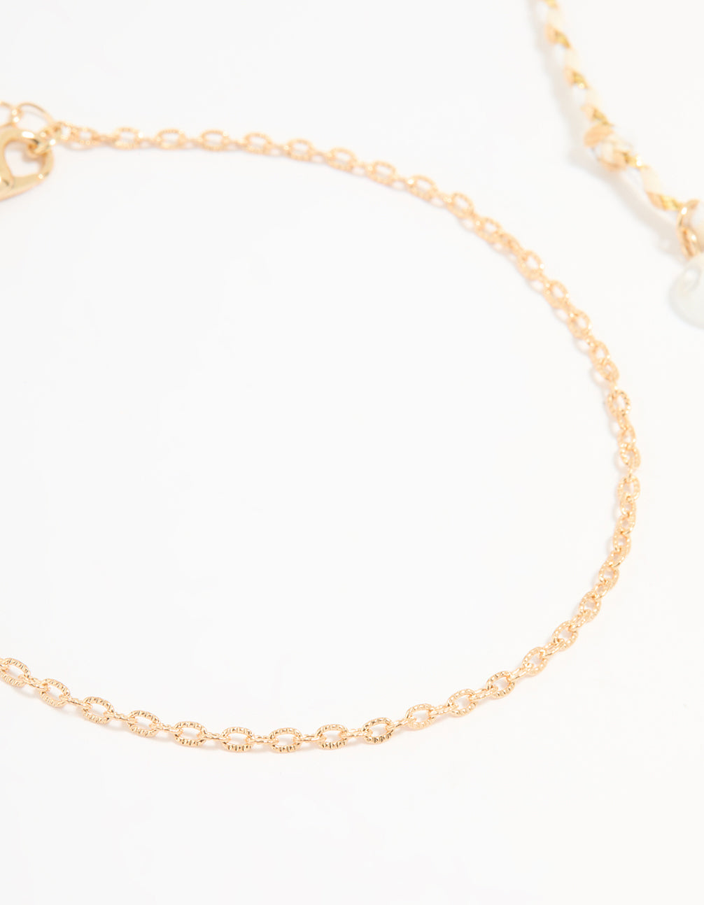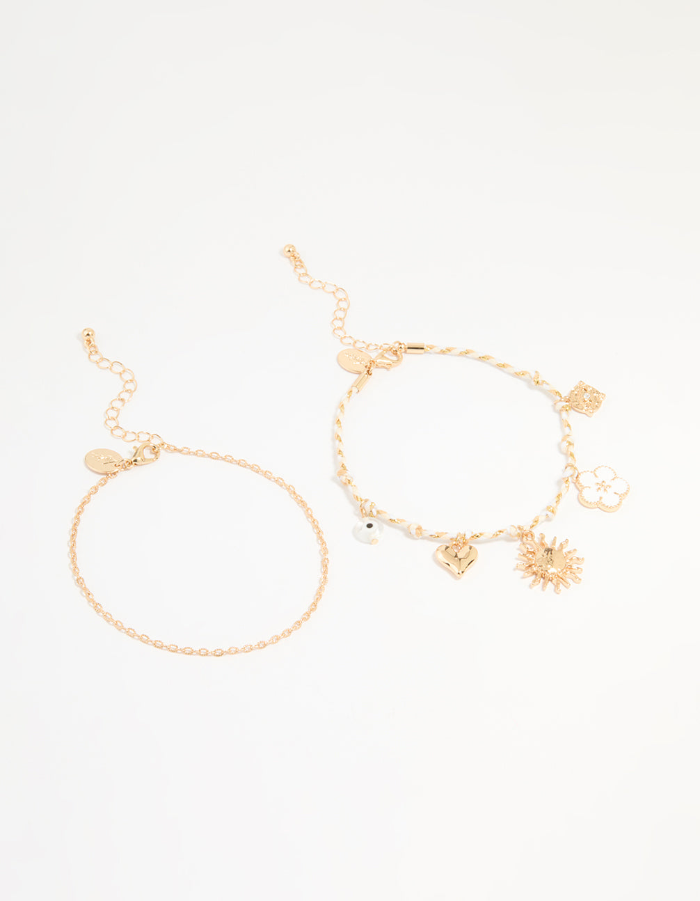 Gold White Rope Sun Charm & Chain Anklets 2-Pack