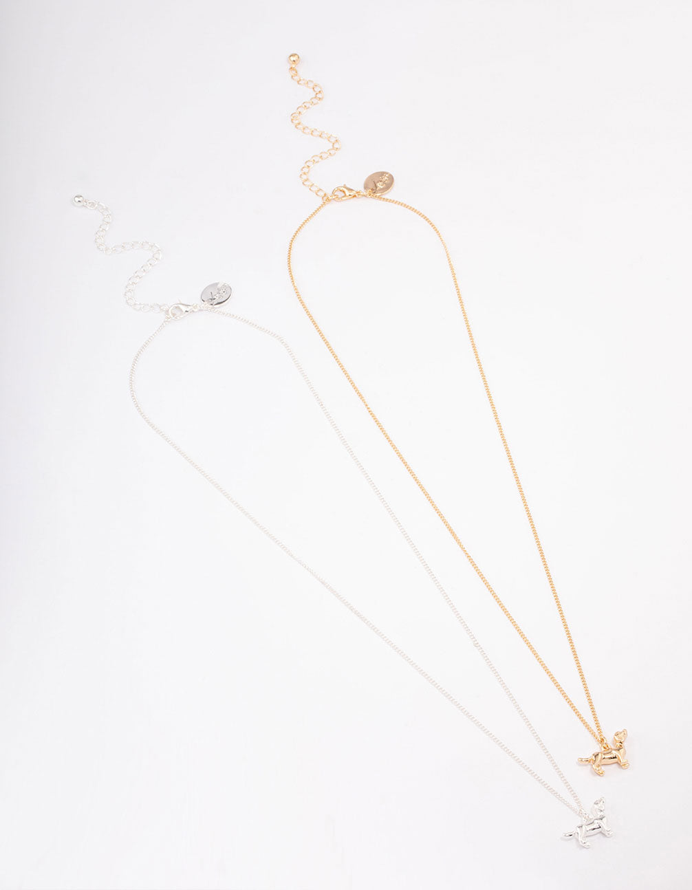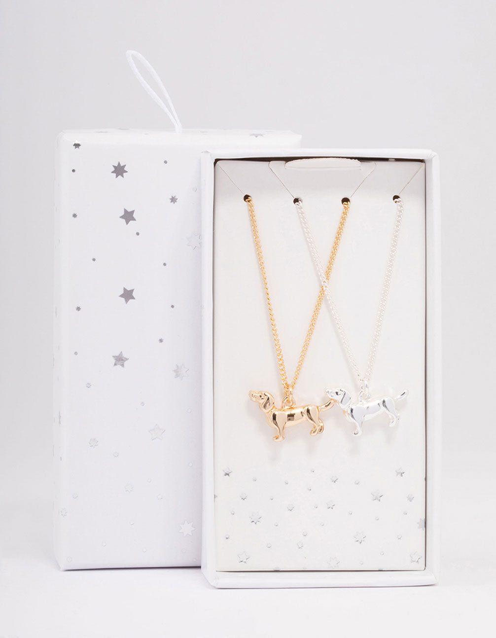 This gift box contains two pendant necklaces adorned with dog charms in gold and silver settings.