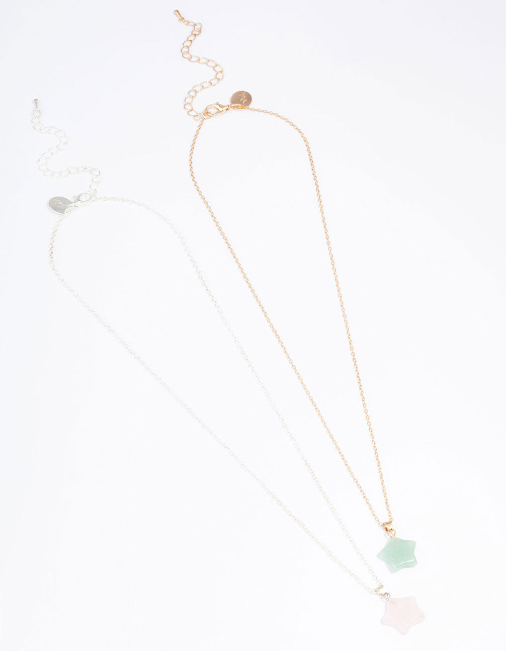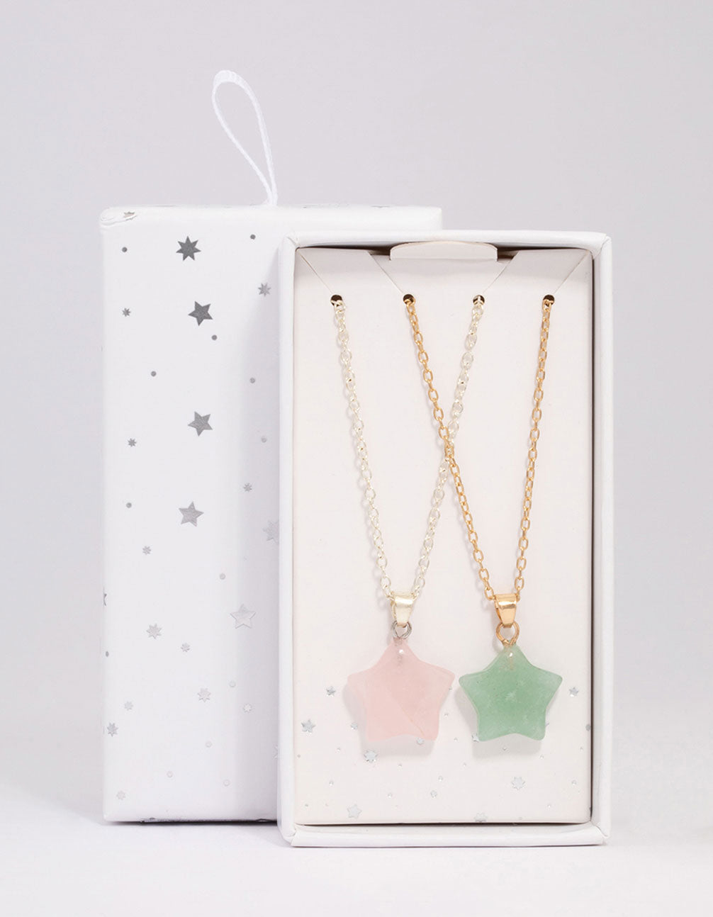 This gift box contains two pendant necklaces adorned with rose quartz and green aventurine, star-shaped charms.