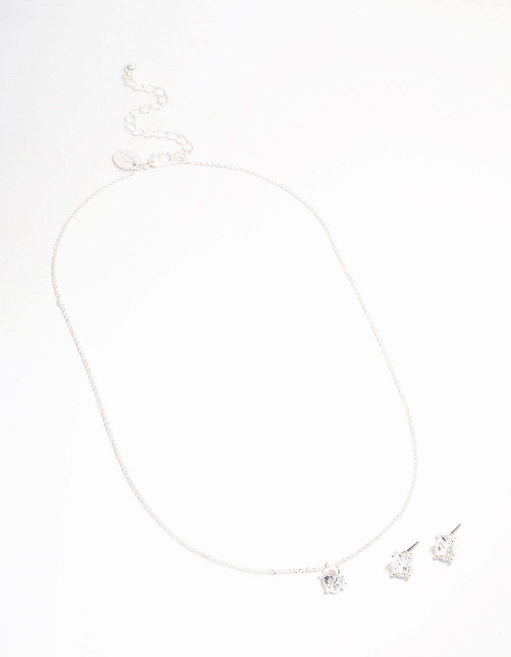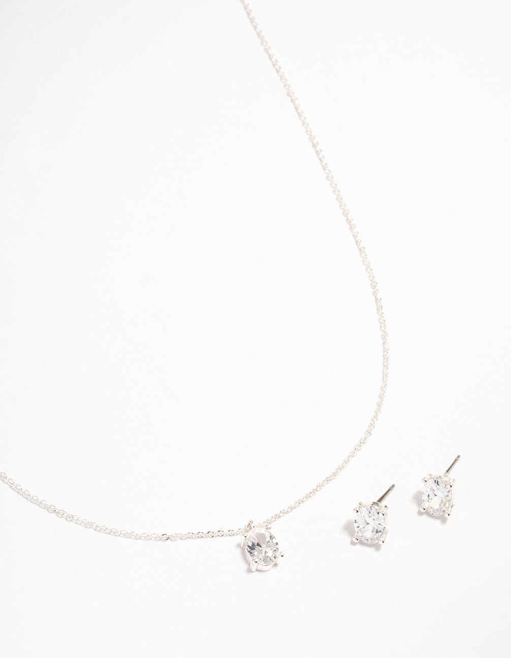 This gift box contains a silver plated jewellery set, featuring a pair of oval cubic zirconia stud earrings and a matching pendant necklace for a modern finish.