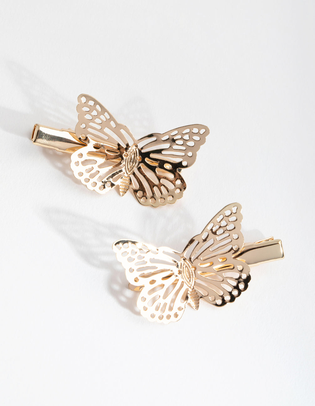 Update your look with new hair accessories! These pretty clips are gold toned and shaped like butterflies. They're perfect for adding a touch of glam to your hairstyles!