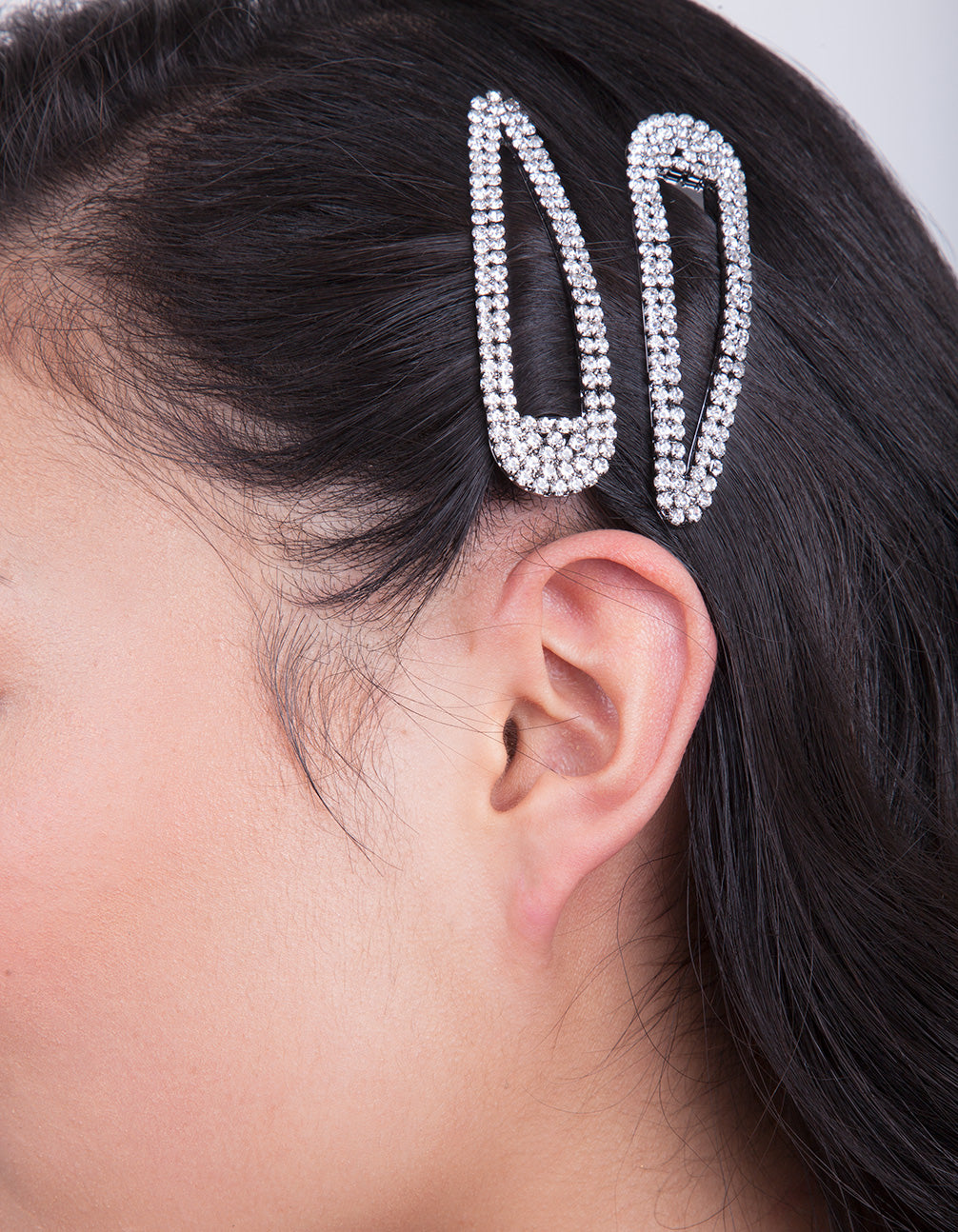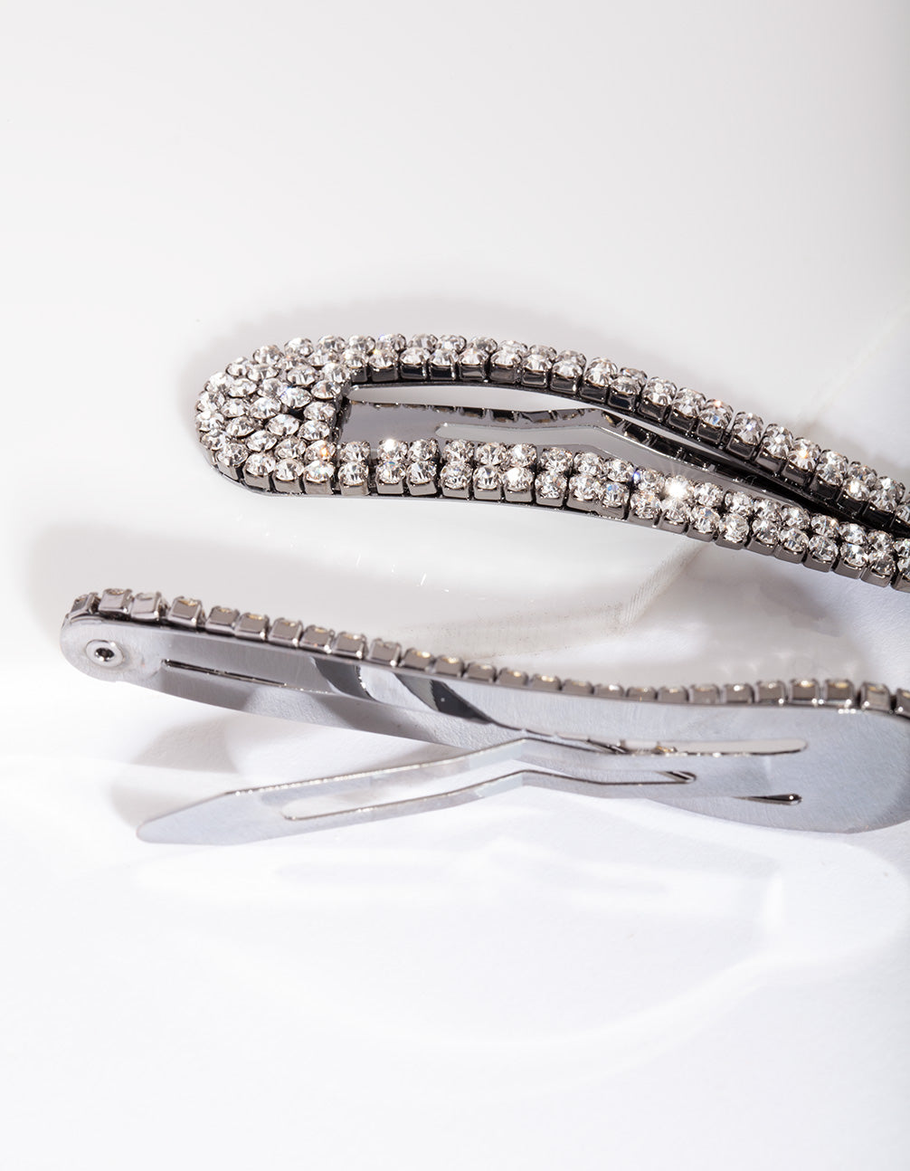 Playful and glamorous! Our hair accessories can dress up any outfit. This duo features a gunmetal diamante embellished design.