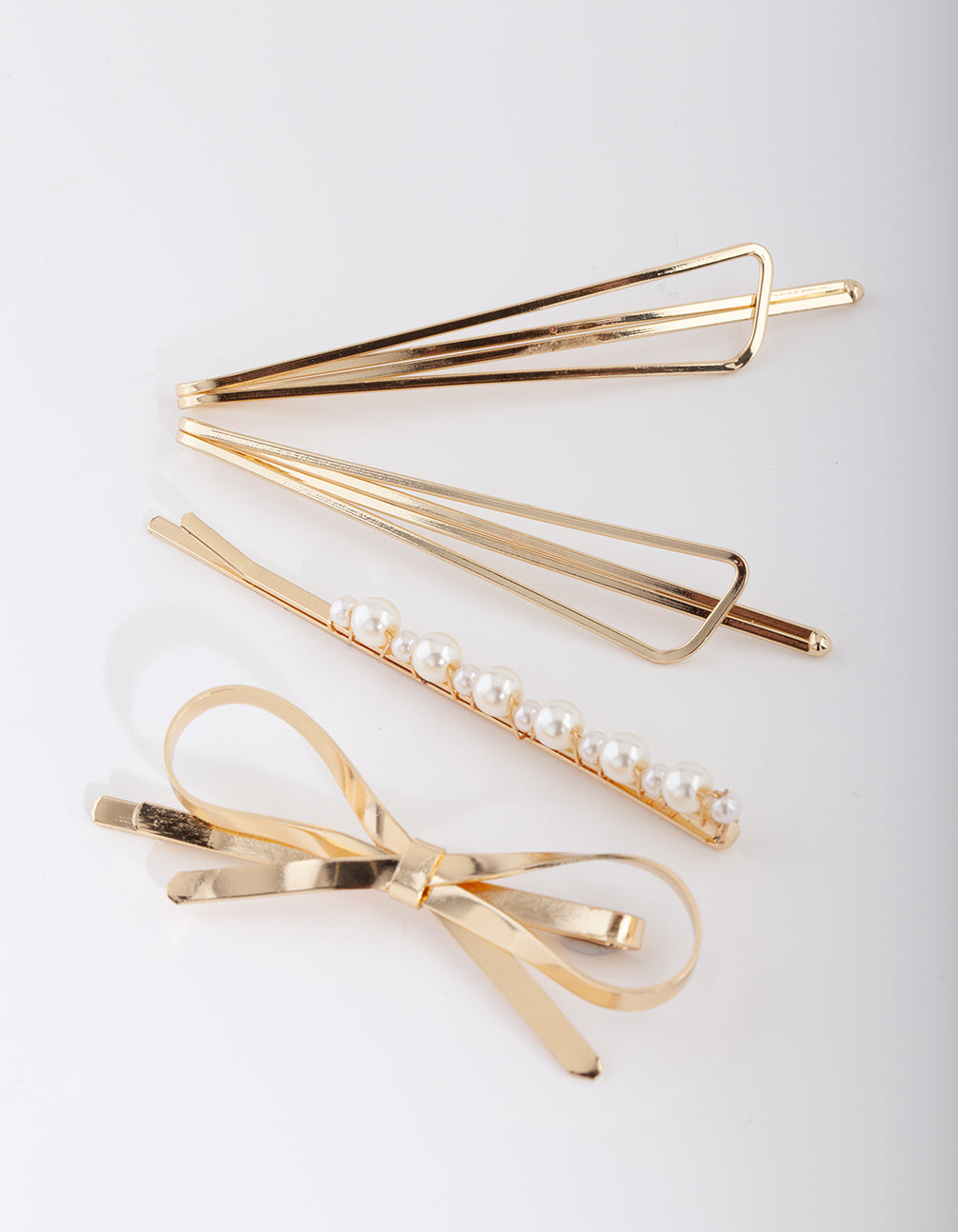 Whether you are heading to brunch, a wedding or just wanting to look glamorous for a party, this hair accessory is the perfect way to complete your event ensemble! This clip pack comes with a variety of gold-toned pearl and bow designs.
