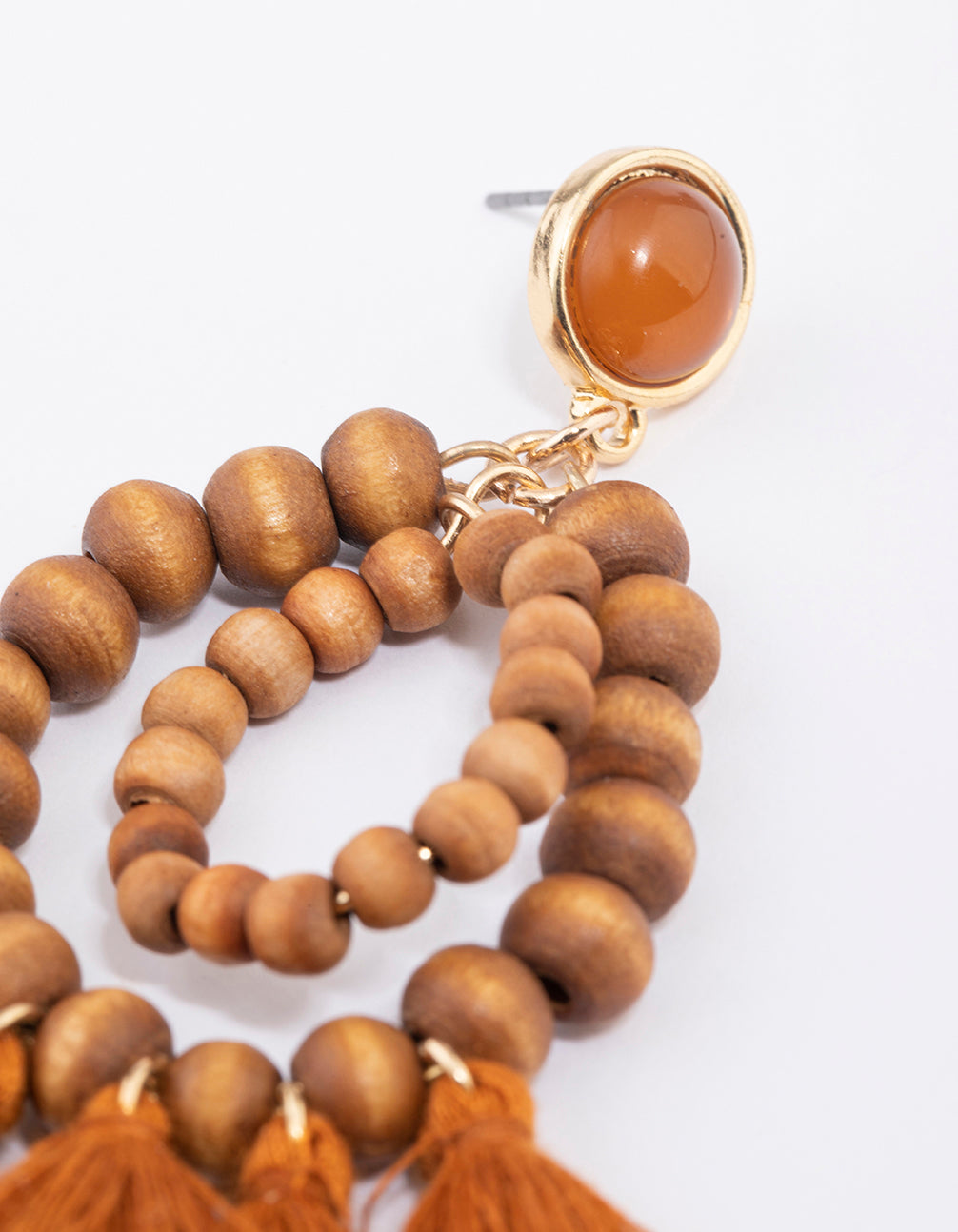 These rustic, orange-coloured fan earrings feature a small, tasseled design with delicate, wooden beading for a resort-inspired look.