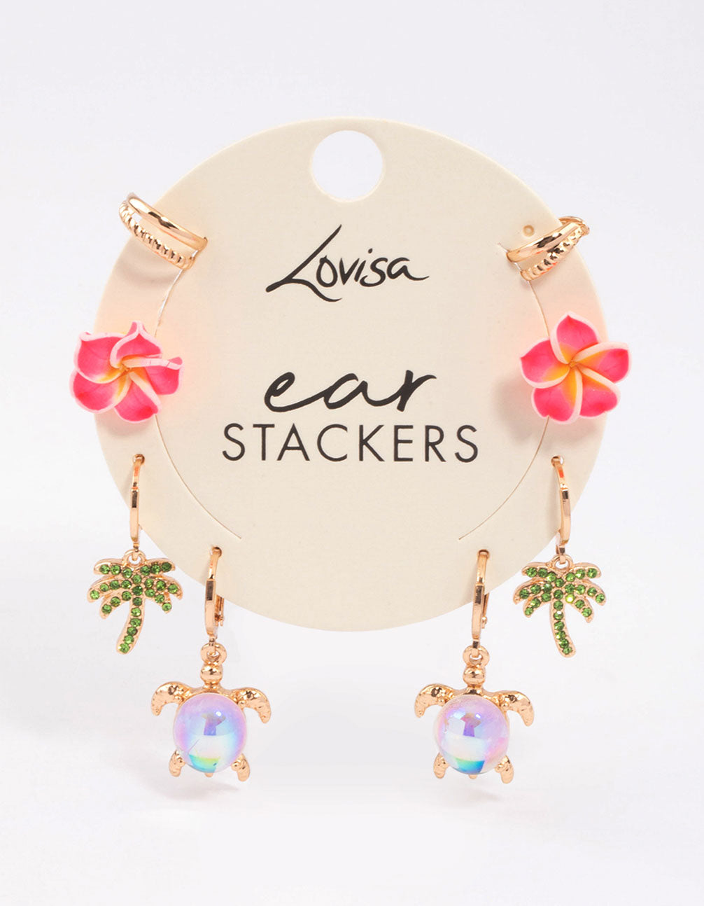 - This ear stack contains eight individual, gold-toned earrings - designed with adorable, tropical charms including palm trees, turtles and palm trees.