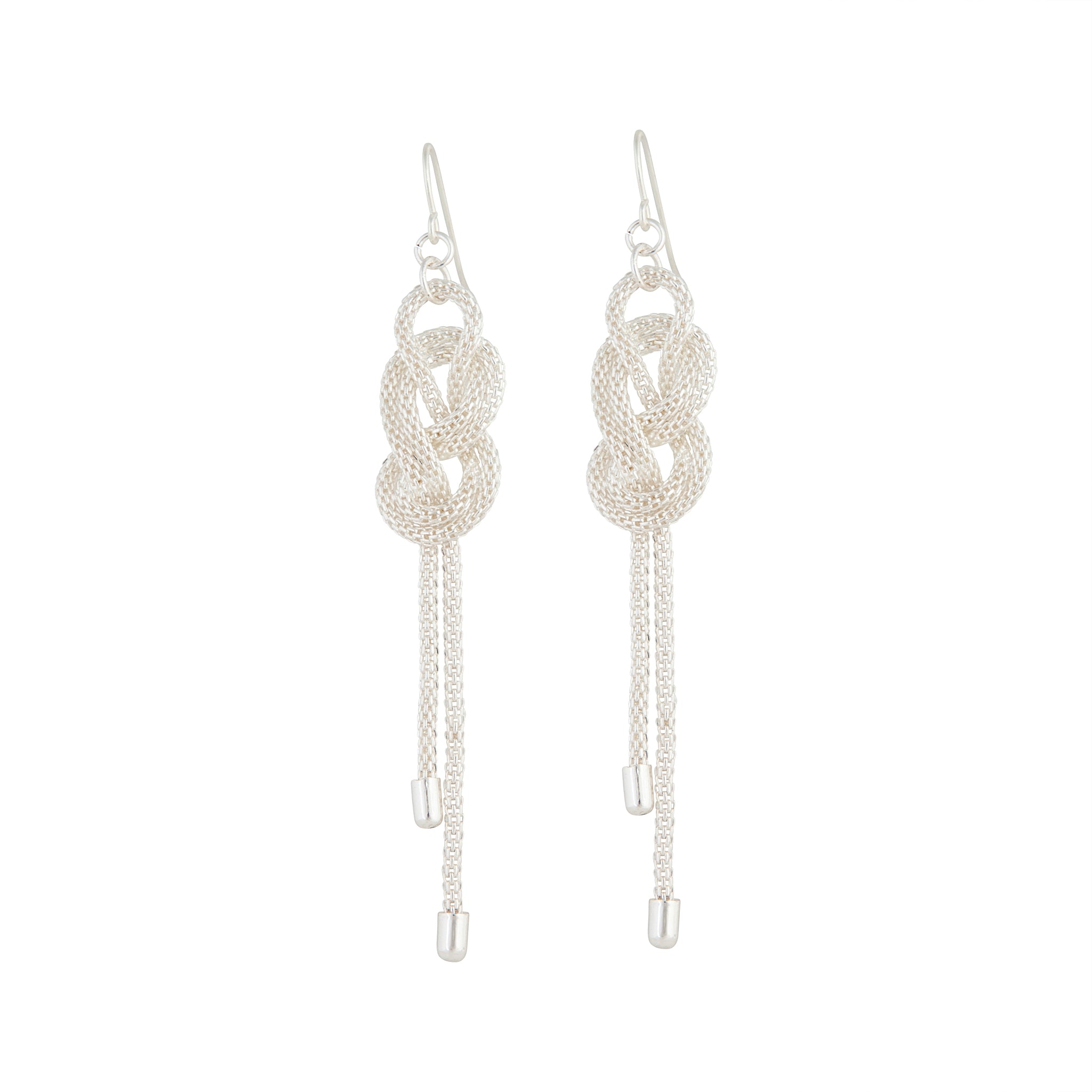 On a hook finish these silver tone drop earrings bring style through their knotted design.
