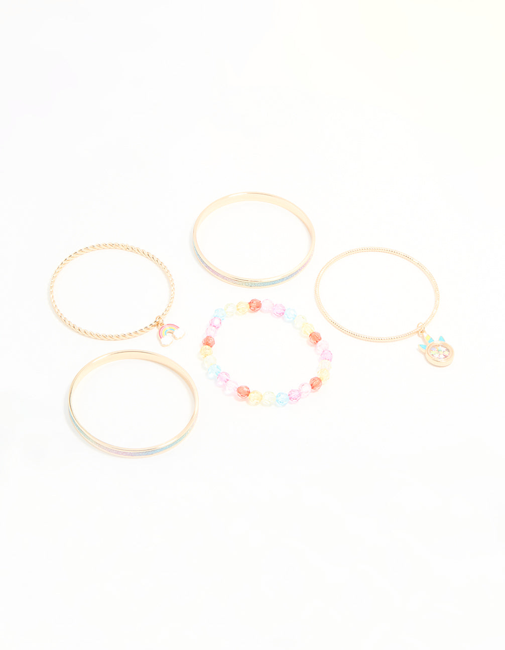 Add a burst of magic to your little one's accessories collection with this Kids Gold Bangles Pack! This playful set includes two sparkling rainbow glitter bangles, a colourful rainbow beaded bracelet, a shaker unicorn bangle, and a bangle with a cute rainbow charm. Perfect for mixing and matching, these gold-tone bracelets are ideal for dressing up any outfit, whether it's for a party, playdate, or just adding some sparkle to a casual look. Lightweight and easy to wear, this charming wristwear set is a fun way to bring bold colours and whimsical designs into their wardrobe. Pair them with a bright dress or jeans and a tee for an effortlessly cool vibe!