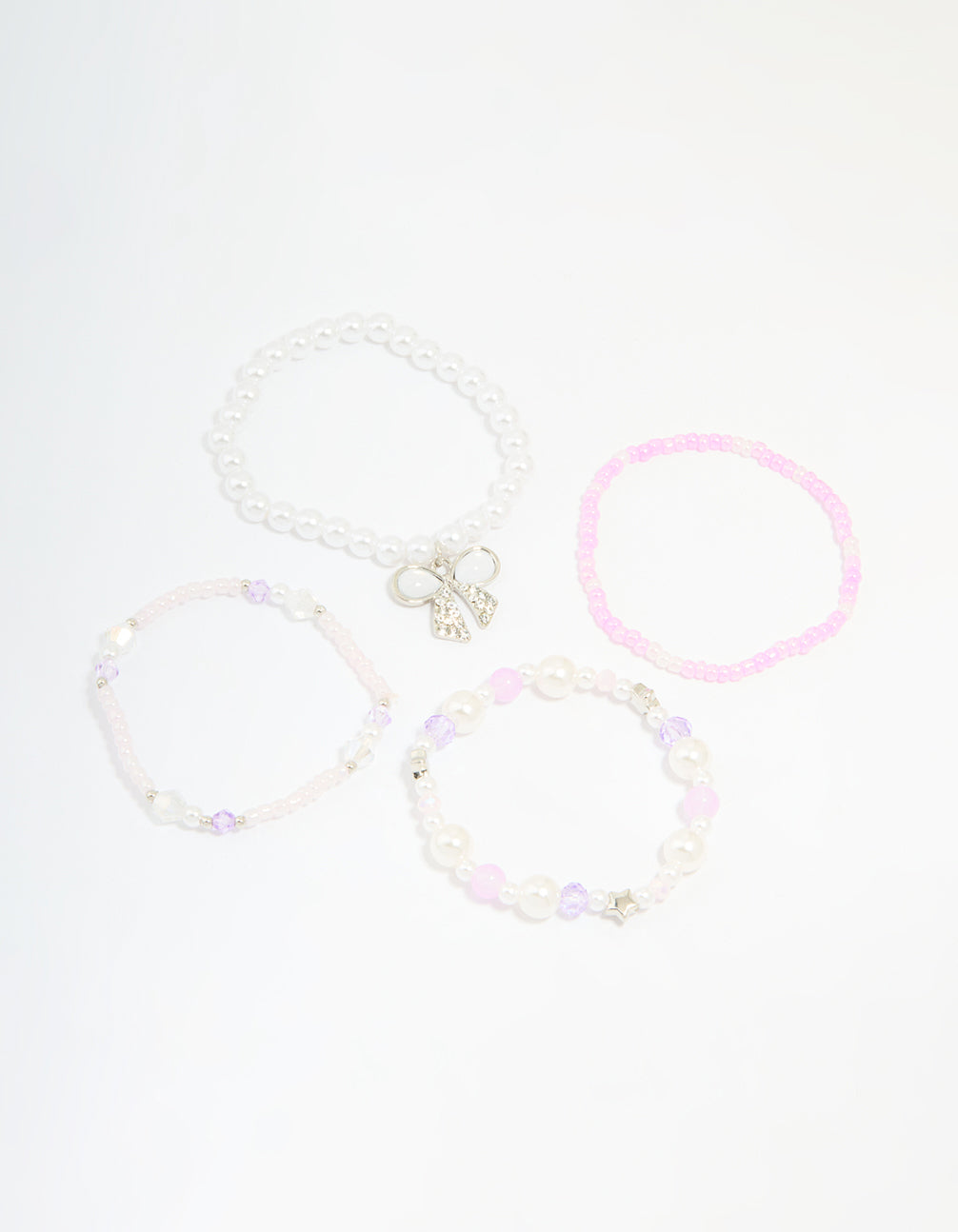 Brighten up your accessory game with this Kids Pink & White Beaded Stretch Bracelets Pack! This playful set includes four charming bracelets: a pearl bow bracelet, a pink beaded bracelet, a purple and white beaded bracelet, and a pearl purple beaded bracelet with star details. Perfect for adding a pop of colour and fun to any outfit, these stretchy bracelets are comfy and easy to wear. Whether dressing up for a birthday party or adding a touch of flair to a casual day out, these bracelets are ideal for kids who love stylish jewellery. Pair them with a cute dress or jeans and a tee for effortless charm.