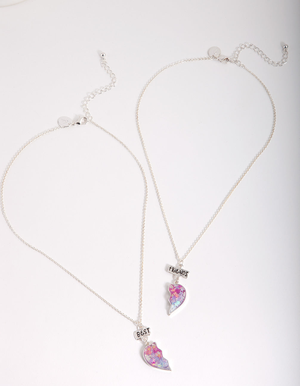 Friends are the family you choose. Represent your closest friendships with this engraved glitter heart necklace set for you and your BFF! The set features a silver tone necklace and a 'Best Friends' tag.