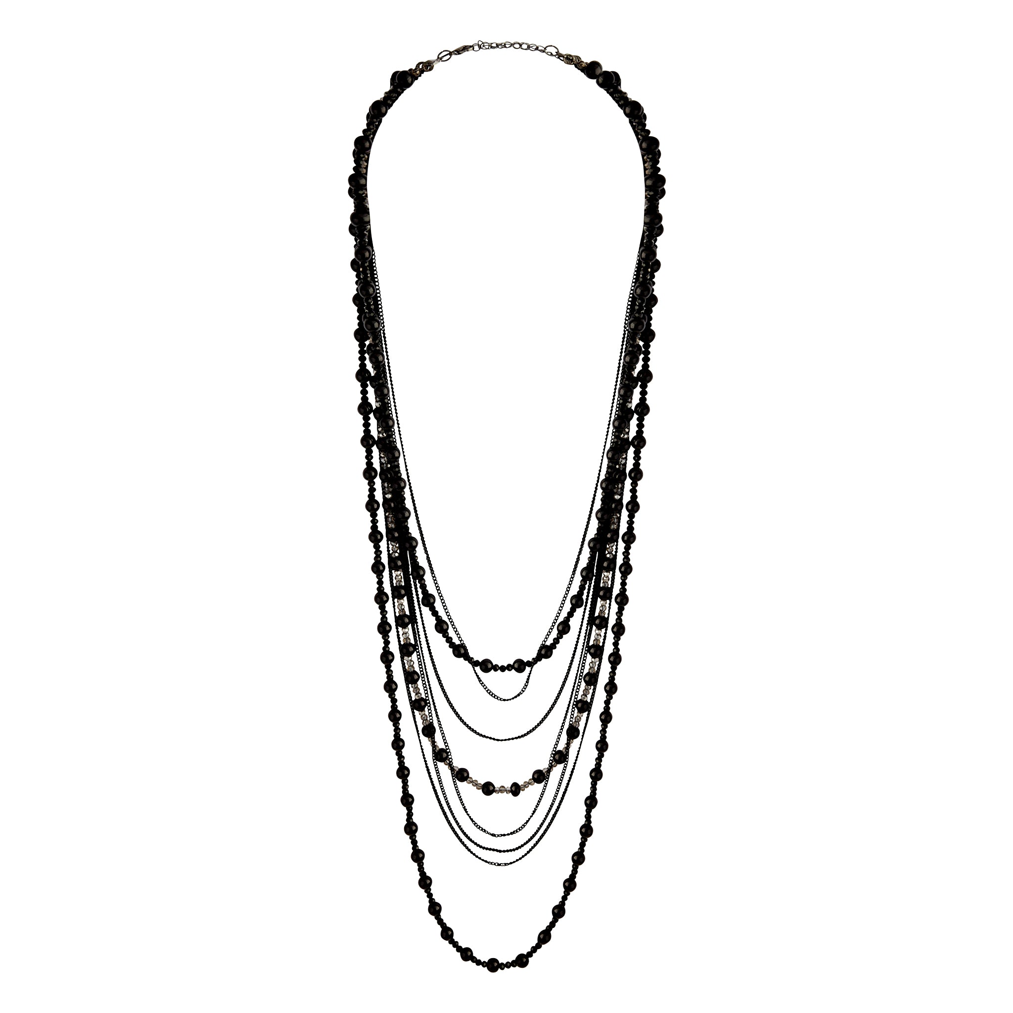 Add a bit of drama to any outfit with black accessories. This is a layered necklace with black beads and a variety of sizes and textures. Get the layered look in one easy step.