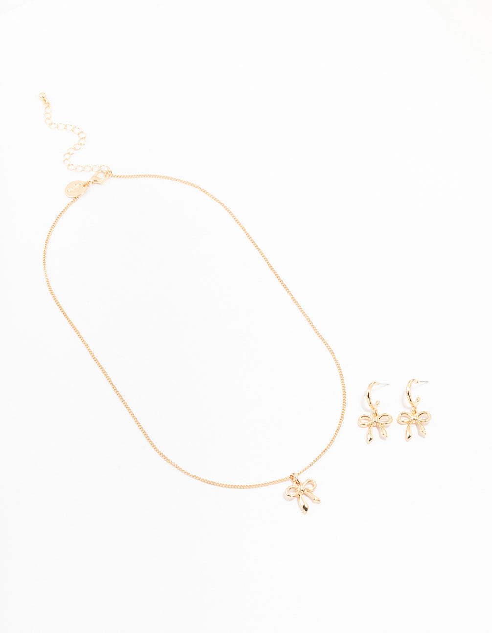 Embrace the oh-so-chic coquette trend with this super pretty gold bow necklace and earring set. This set adds a clean and sophisticated yet flirty look to your everyday. This set is perfect for treating someone you love or yourself.