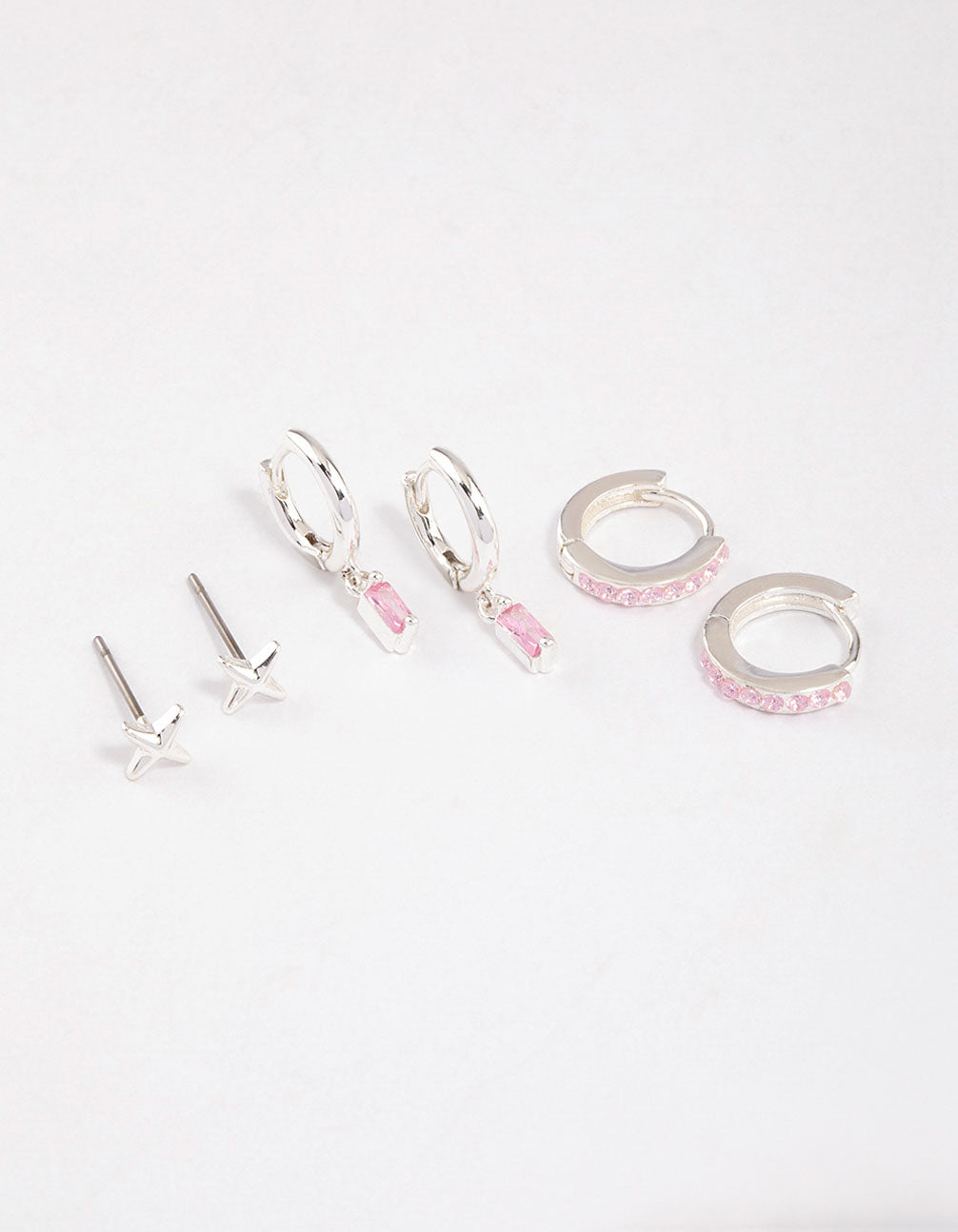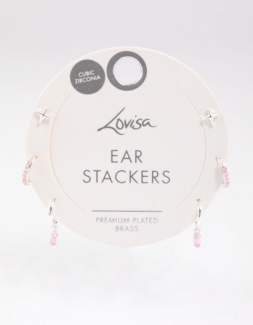 - This earring pack contains six earrings, designed with pink baguette stones for a Barbie-inspired look.