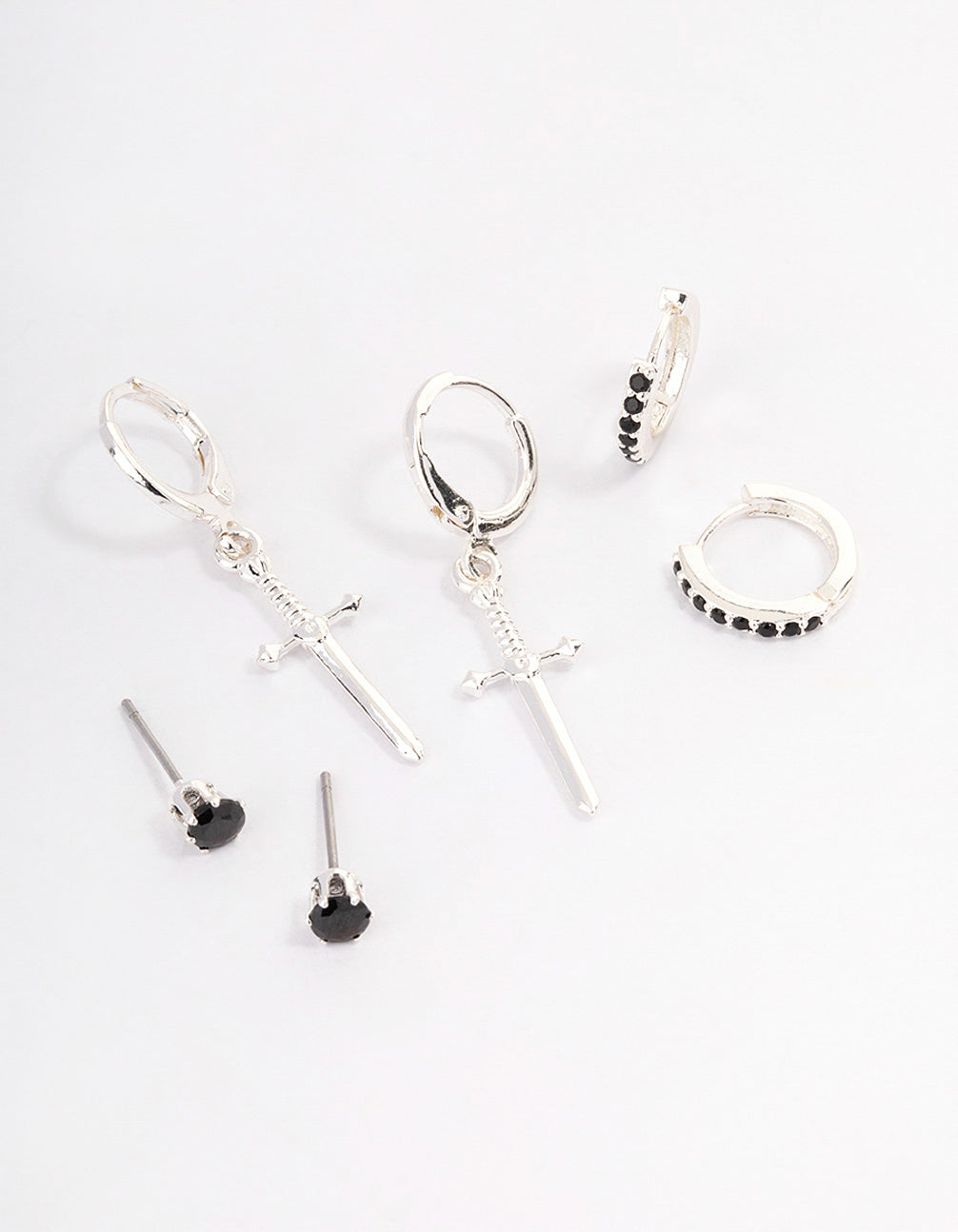Treat yourself to luxury with jewellery from the Lovisa Luxe Collection! This set of three silver plated brass huggie hoop earrings are each adorned with a sparkling cubic zirconia dagger, adding a touch of edge to any outfit.