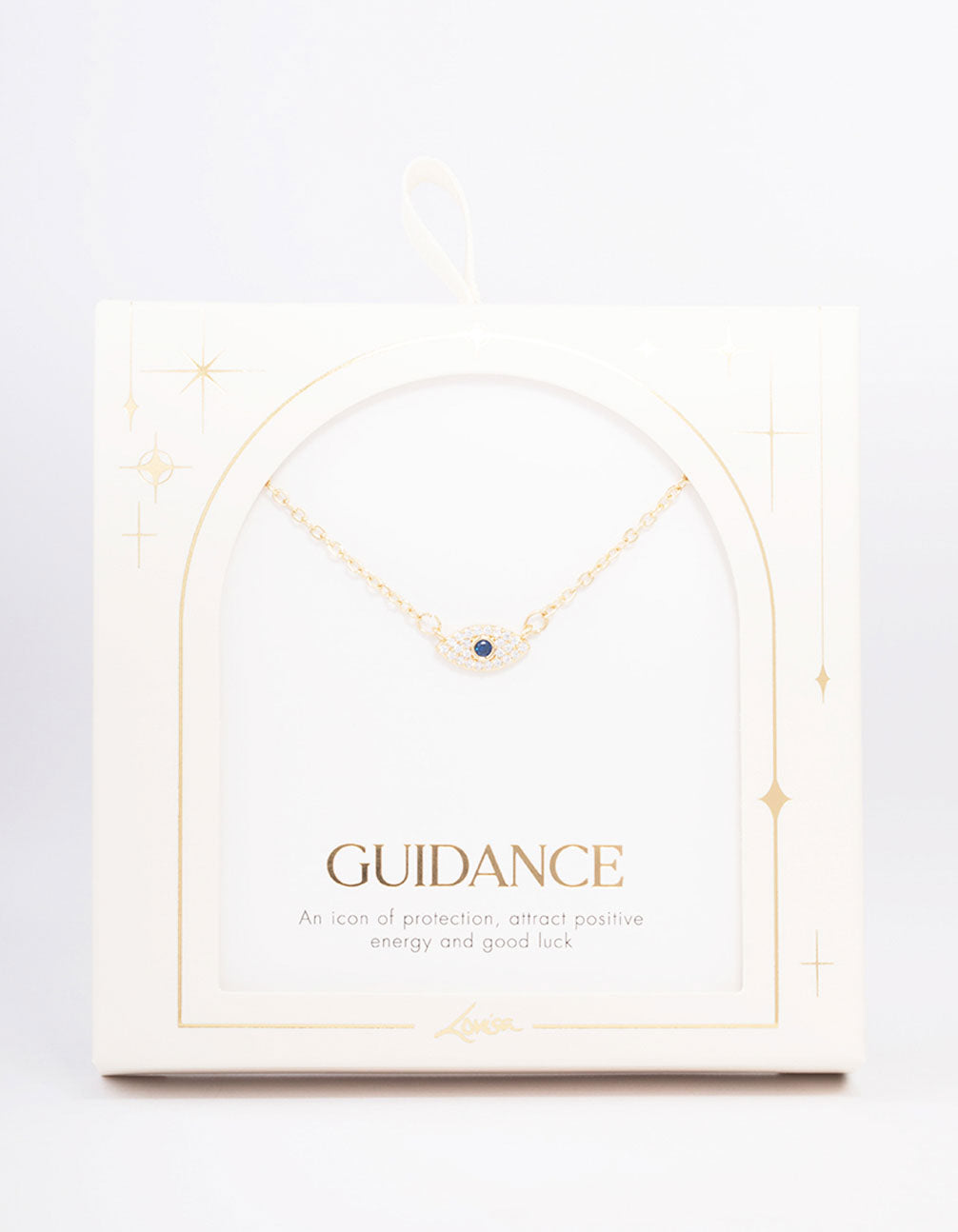 This gift set features a gold plated pendant necklace adorned with a cubic zirconia encrusted evil eye charm for a touch of glamour.