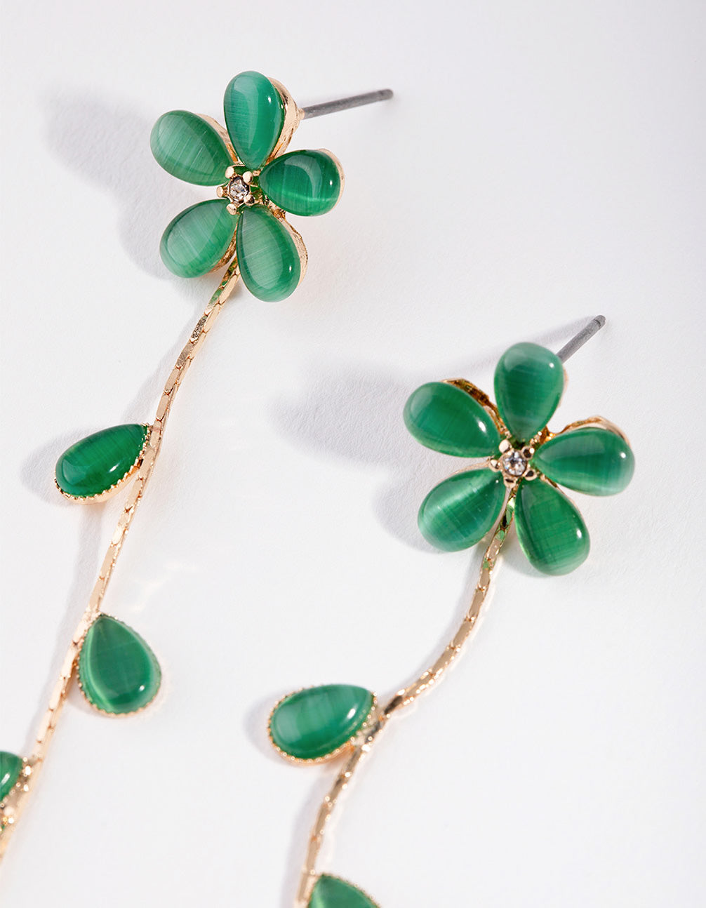 Add a pop of colour to your outfit with a fun pair of earrings! These lovely gold-toned earrings feature a green flower design, with a hanging bead-studded vine. They have a playful 70s vibe. Flower power!