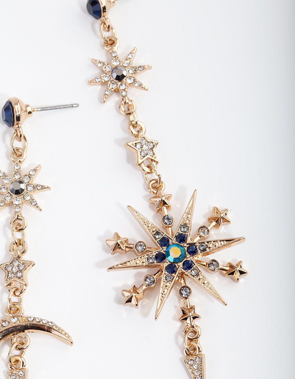 Shine as bright as the night sky with these stunning gold-toned drop earrings. They feature a sapphire-blue embellishments on a dramatic drop design with star and moon motifs.