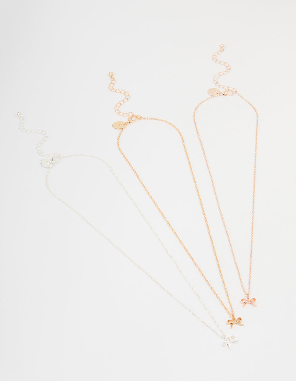 Looking for the perfect jewellery set to elevate your everyday style or add a chic touch to your outfit? This Mixed Metals Bow Necklaces Pack is here to charm! Featuring three dainty necklaces with adorable bow-shaped designs in mixed metal tones, this set is as versatile as it is stylish. Whether you're layering them for a stylish, stacked look or wearing one solo for understated elegance, these necklaces are perfect for any occasion. Pair with a casual jumper and jeans for a relaxed vibe or a sleek dress for a polished finish. Ideal for everyday wear or special outings, they also make a thoughtful gift for someone special—or a cute treat for yourself!