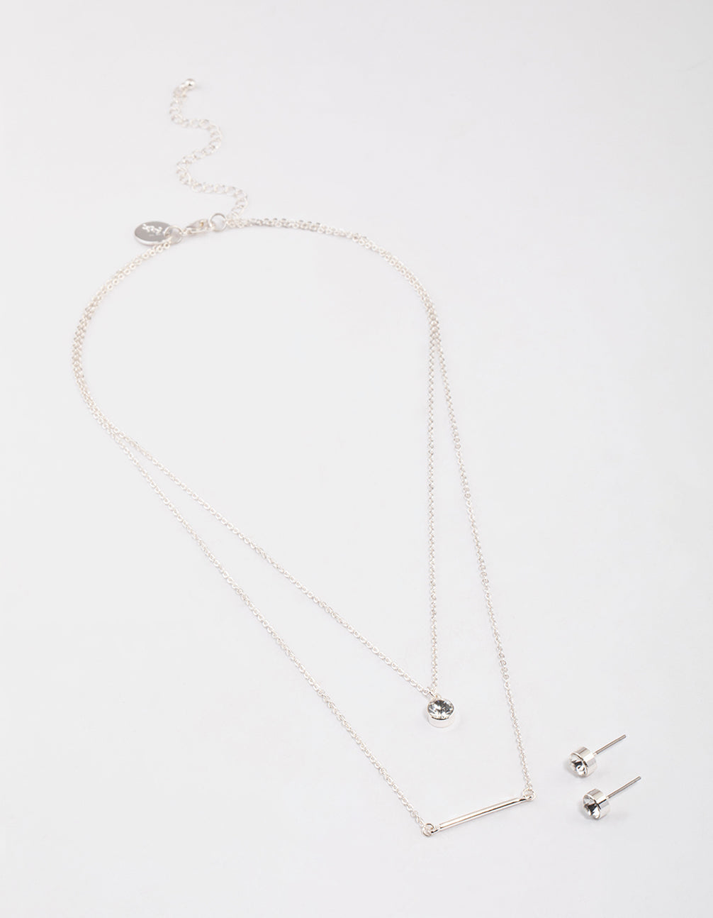 - This jewellery set features a silver layered, stone bar necklace and adorning pair of earrings.