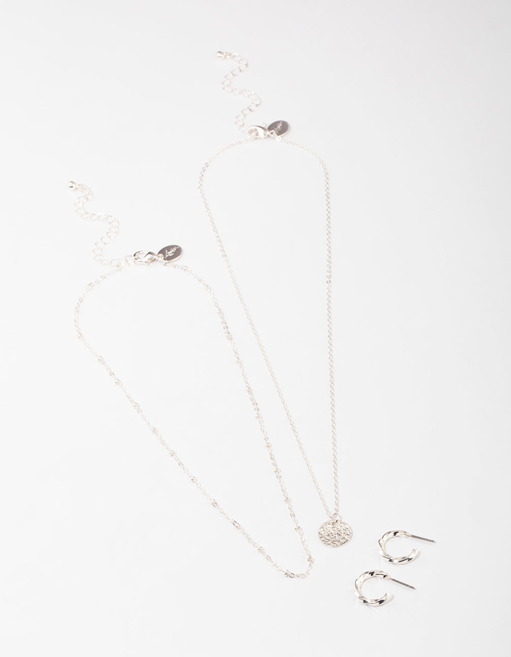 - This jewellery set features a silver layered, textured disc necklace and matching pair of earrings.
