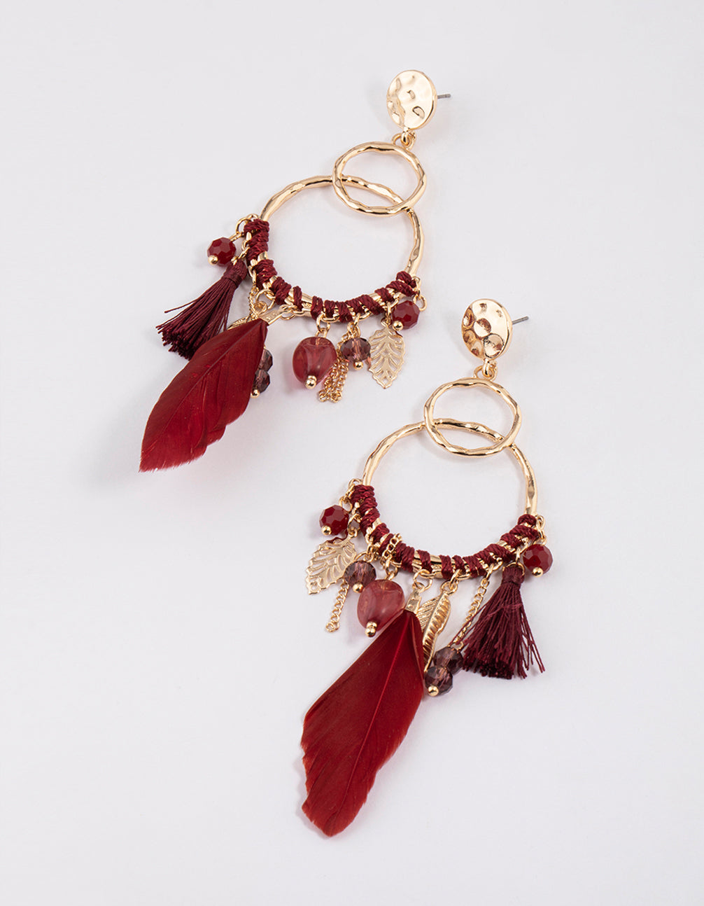 Strive for oppulence with pieces from our glamorous, Opulent Jewels Collection! These gold-toned drop earrings feature a trio of linked hoops, with a threaded string of maroon yarn formed into tassels, with maroon stones and feather details for an extravagant look.