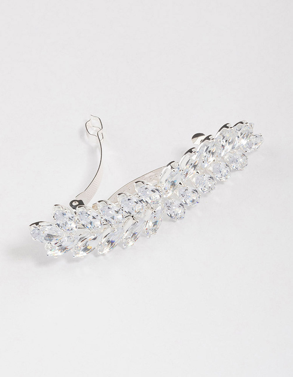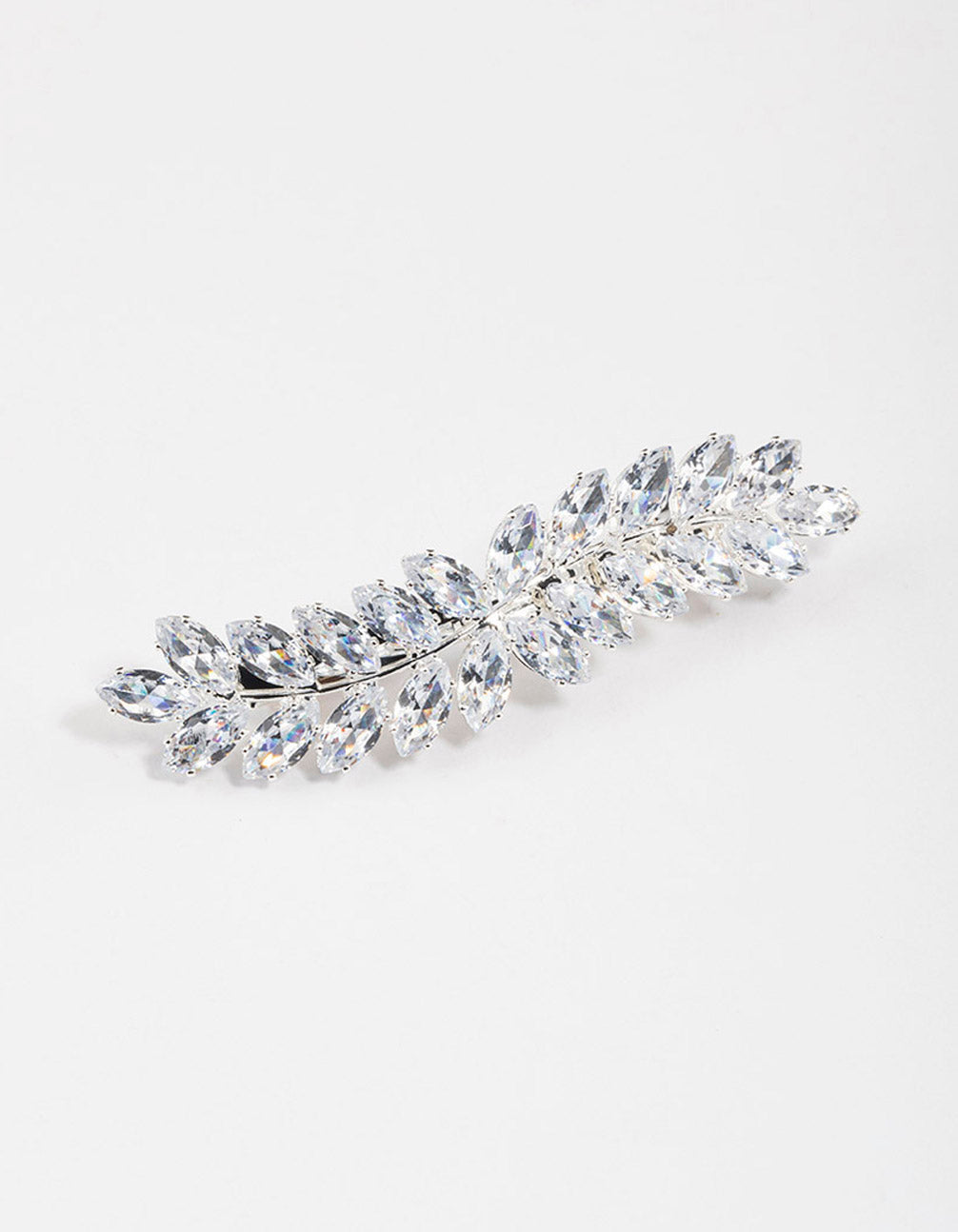 - This hair clip features a silver setting with a leaf design, embellished with cubic zirconia crystals.