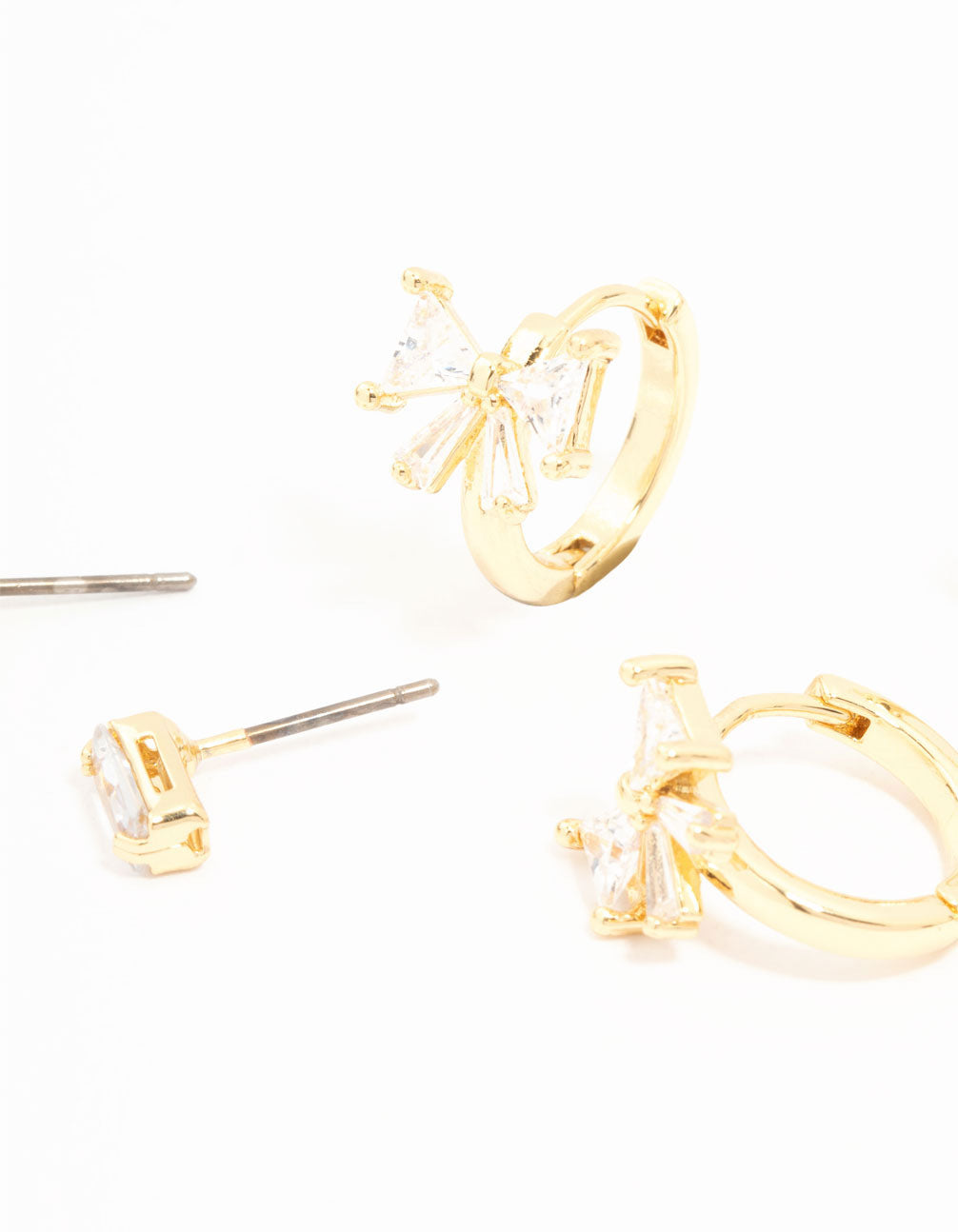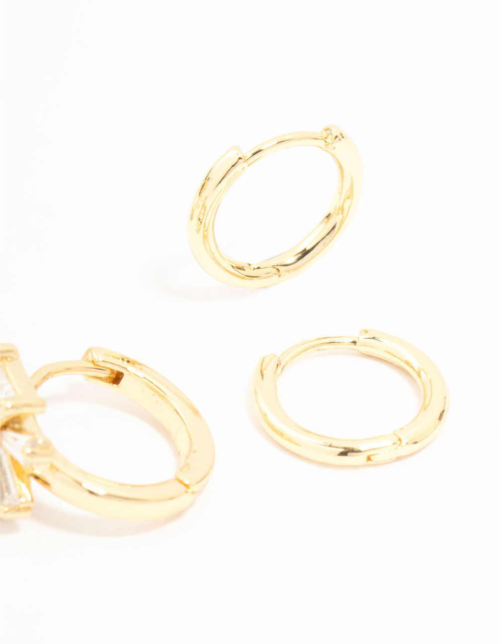 Real Gold Plated Baguette Cut Cubic Zirconia Bow Huggie Earrings 3-Pack