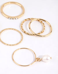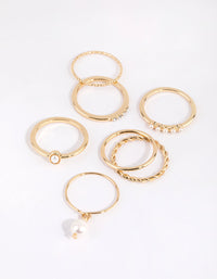 Go for gold with this beautiful ring pack. It features seven rings which are plated with genuine gold for authentic lustre and shine. Each has a different design, with some boasting detailed textures and others featuring freshwater pearl details. Layer them together for maximum impact!