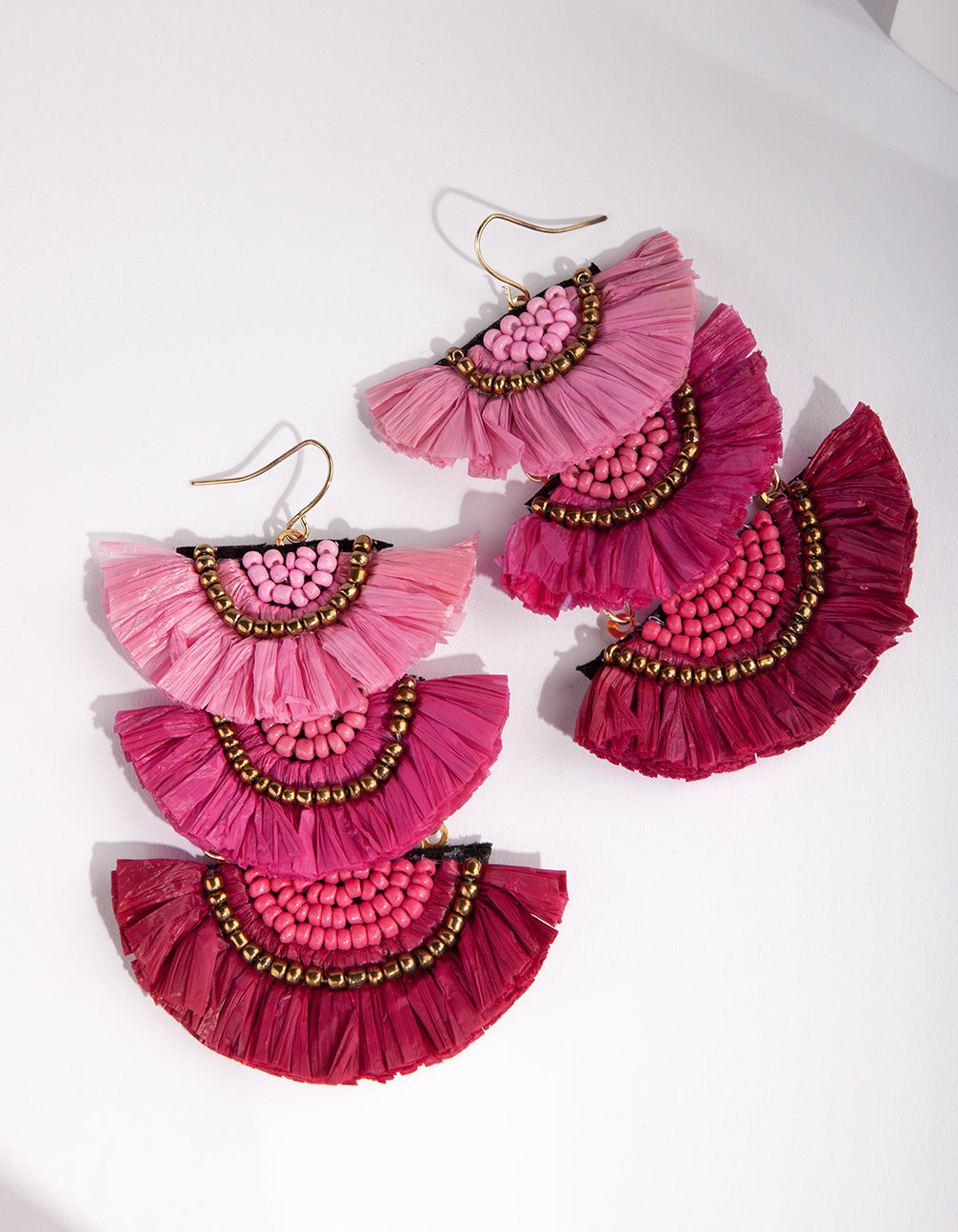 Statement earrings have become the easiest way to switch up any wardrobe. Conversation-starting styles mean that a new pair of earrings replaces the need for a new dress. These earrings boast a pink and red fringe design with beaded detailing.