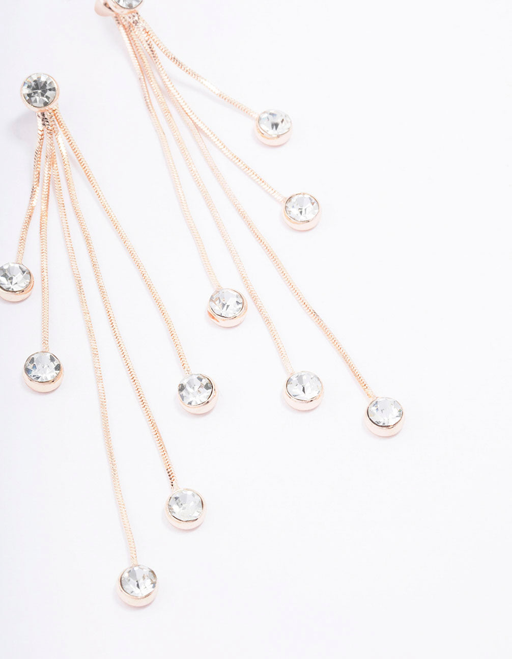 - These lovely drop earrings feature thin rose gold strands adorned with delicate diamante crystals for a touch of glamour.
