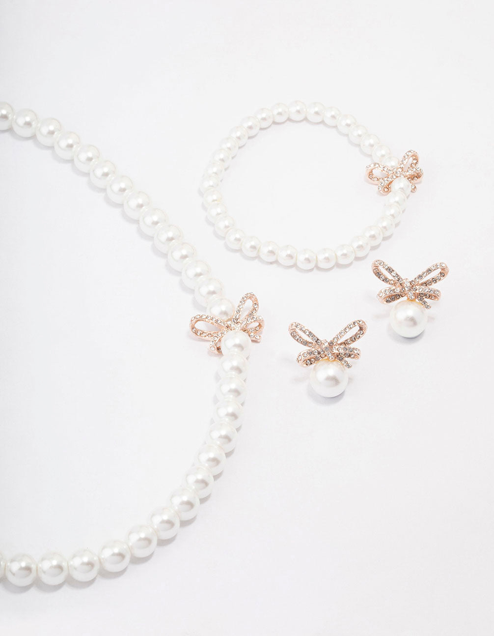 - This cohesive jewellery set contains a pair of rose gold earrings adorned with pearls and bows, as well as a matching necklace and bracelet to complete the look.