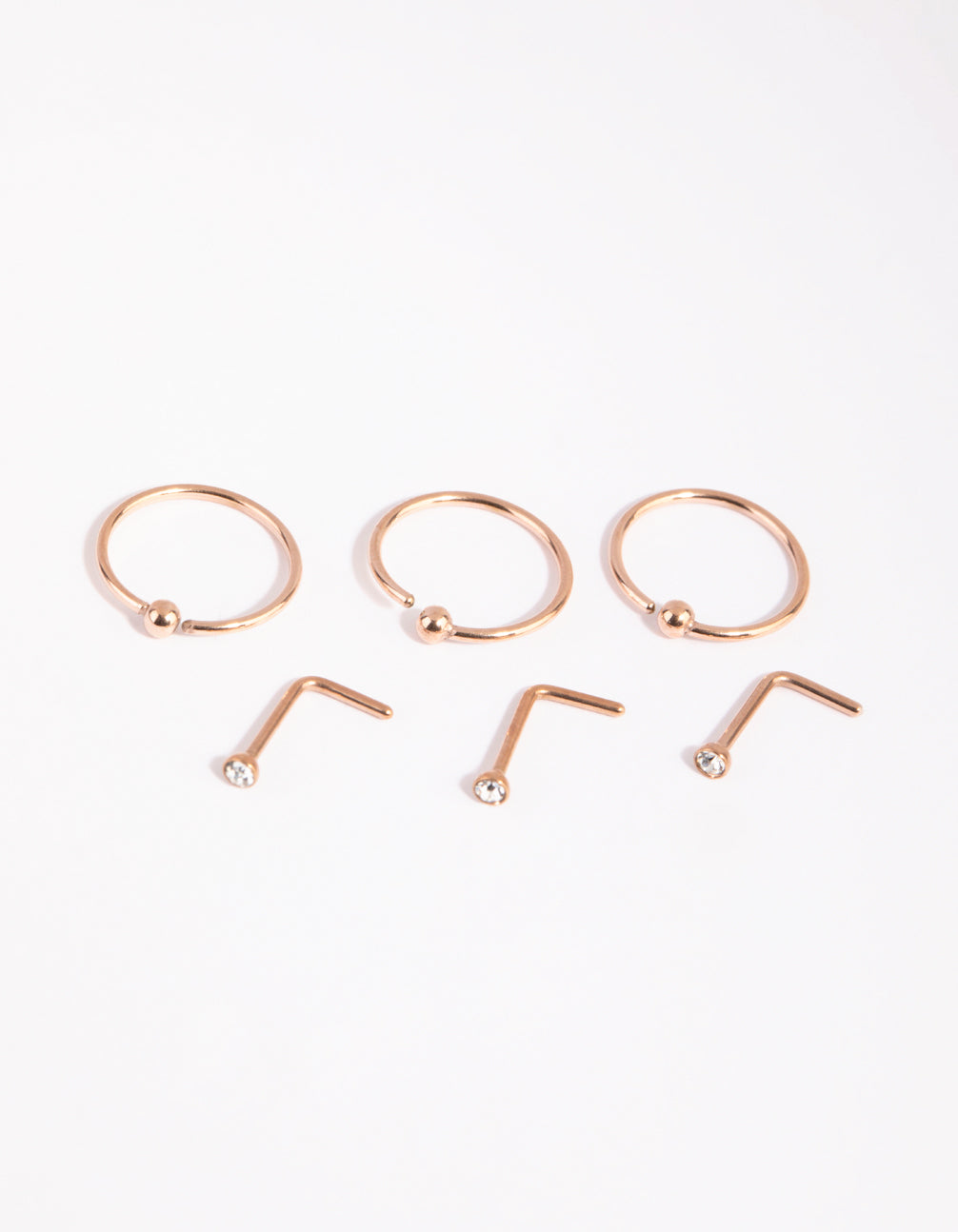 Lovisa body jewellery is made from surgical steel, making it the perfect option for everyday wear. This collection has been made with piercings in mind and features both trend-led and classic styles that you can swap out to suit any occasion. This nose ring pack features 6 individual rose gold-toned nose rings and studs adorned with diamantes. Mix and match your nose rings to coordinate with Lovisa accessories for a fashion-forward look!