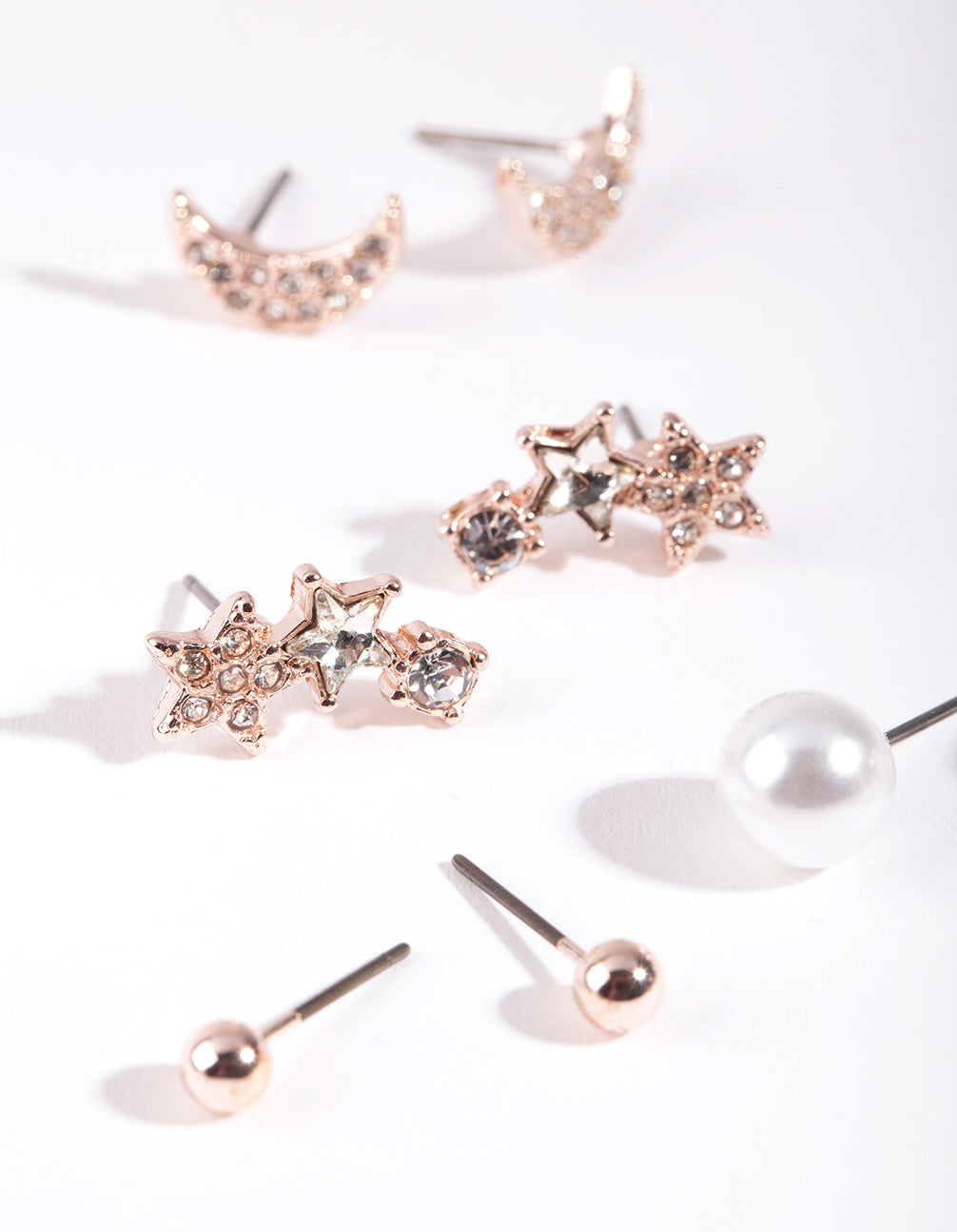 This rose gold toned pack includes pairs of stud earrings in classic and celestial motifs featuring pearl diamante details. the perfect to curate your own magical ear stack.