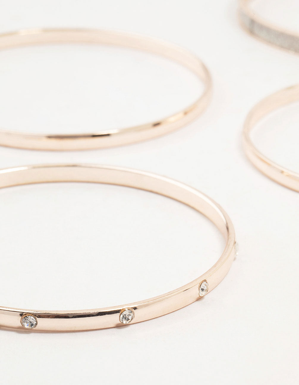 Add some glam with this radiant rose gold bangle pack! Featuring 5 bangles with glitter paper, diamante inlays, and smooth designs, it's perfect for a pretty look every time.