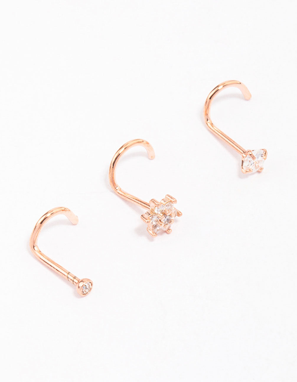 This nose piercing pack features three corkscrew nose studs, plated with real rose gold for a luxe finish.