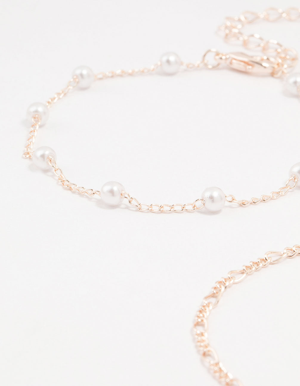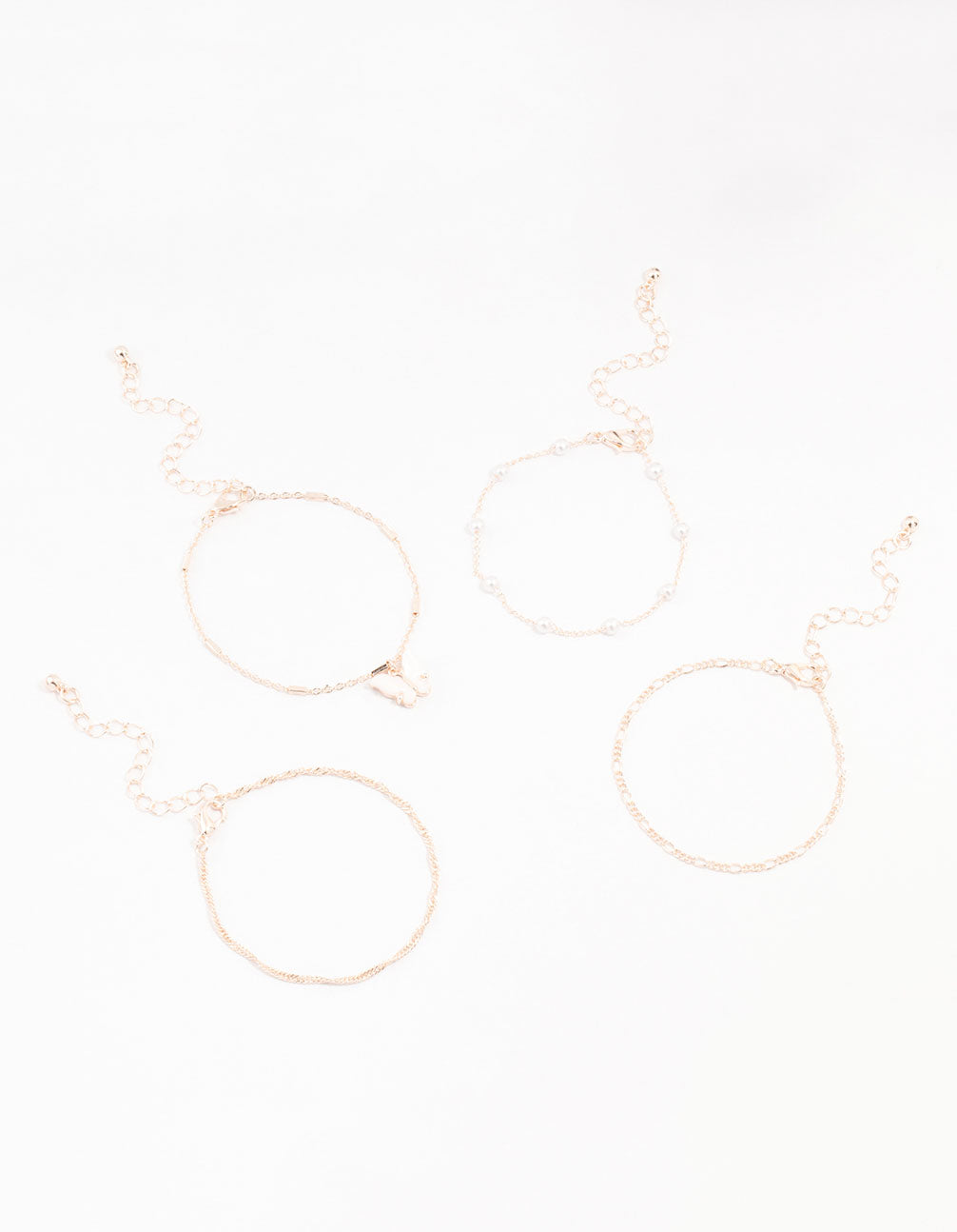 Embrace effortless style with this set of four rose gold-toned bracelets. Spoil yourself with options that include elegant pearl detailing, a butterfly stone design, and two classic chain styles. Stack them for a polished and versatile look.