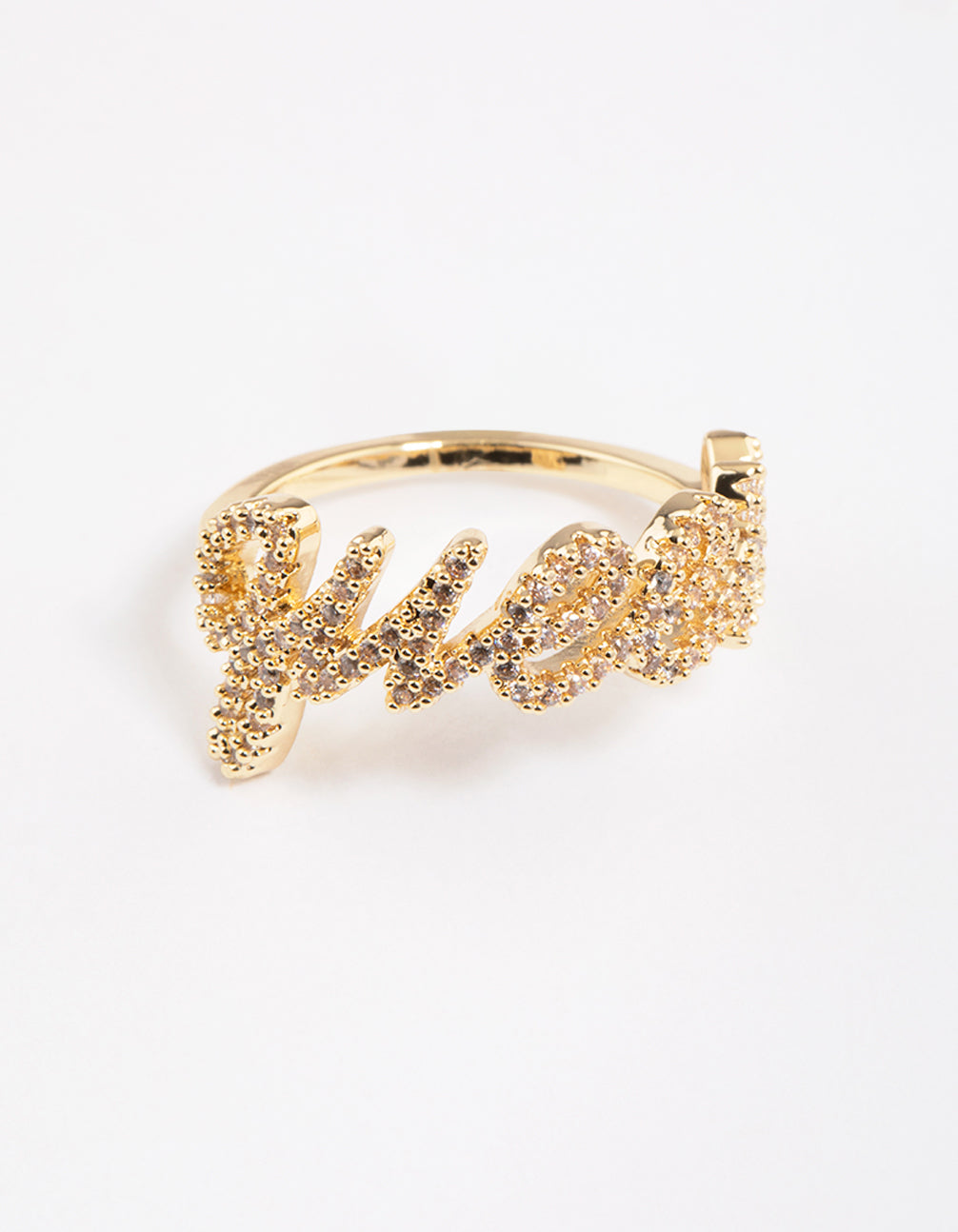 Crafted from genuine gold and delicate cubic zirconia crystals, this script ring can serve as a reminder in your daily stack to act like royalty. Discover our collection of bestselling rings from our Gold Plated Collection and curate a signature, layered look.