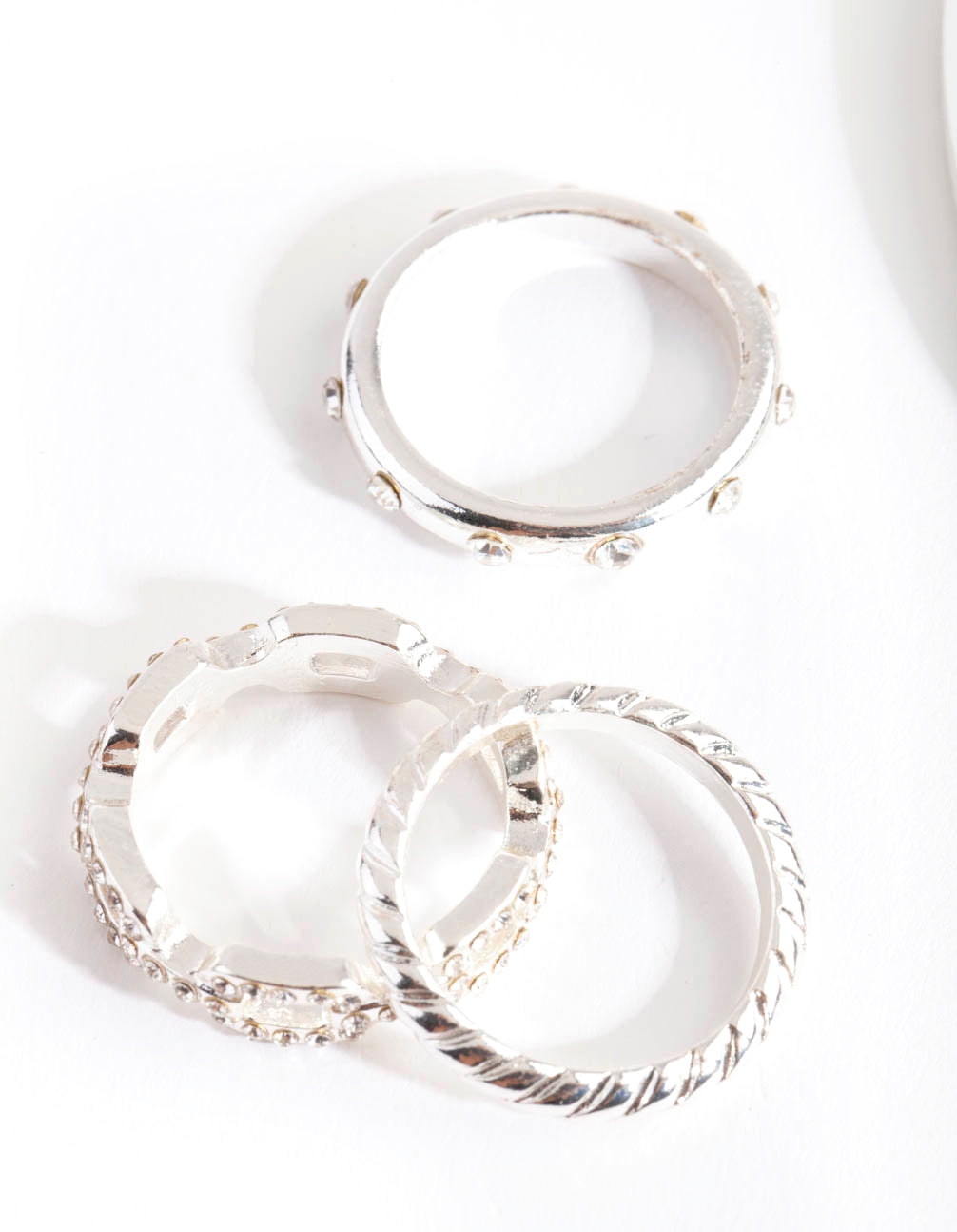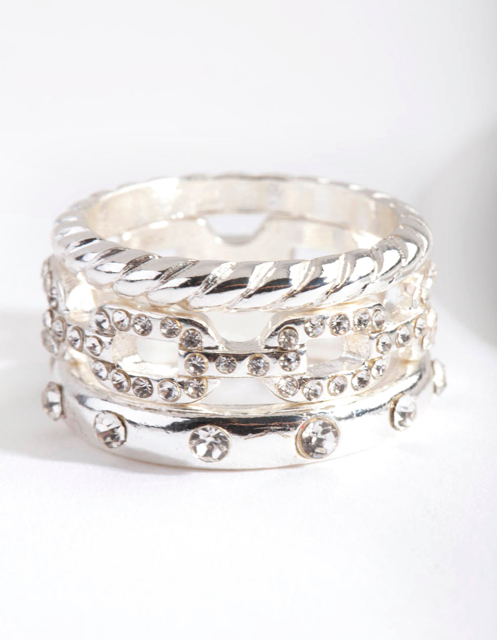 Make a statement in a stunning fashion ring. Stack with other styles for extra impact or wear alone for a refined addition to your ensemble. This ring stack boasts a silver-toned chain design with diamante detailing.