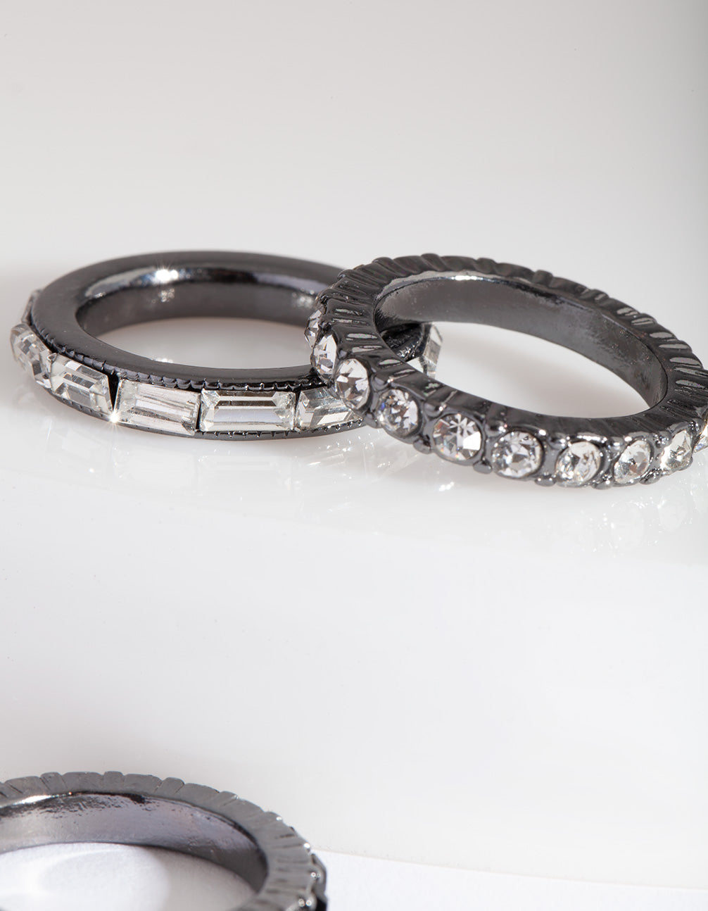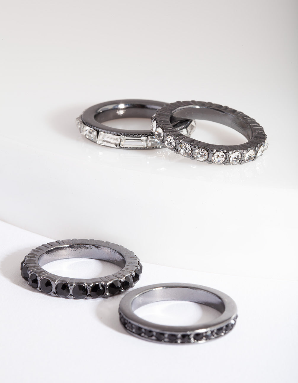 Ring stacking is a major trend. Ring packs allow you to mix and match to customise your look. This style features a gunmetal-toned setting with black diamantes.