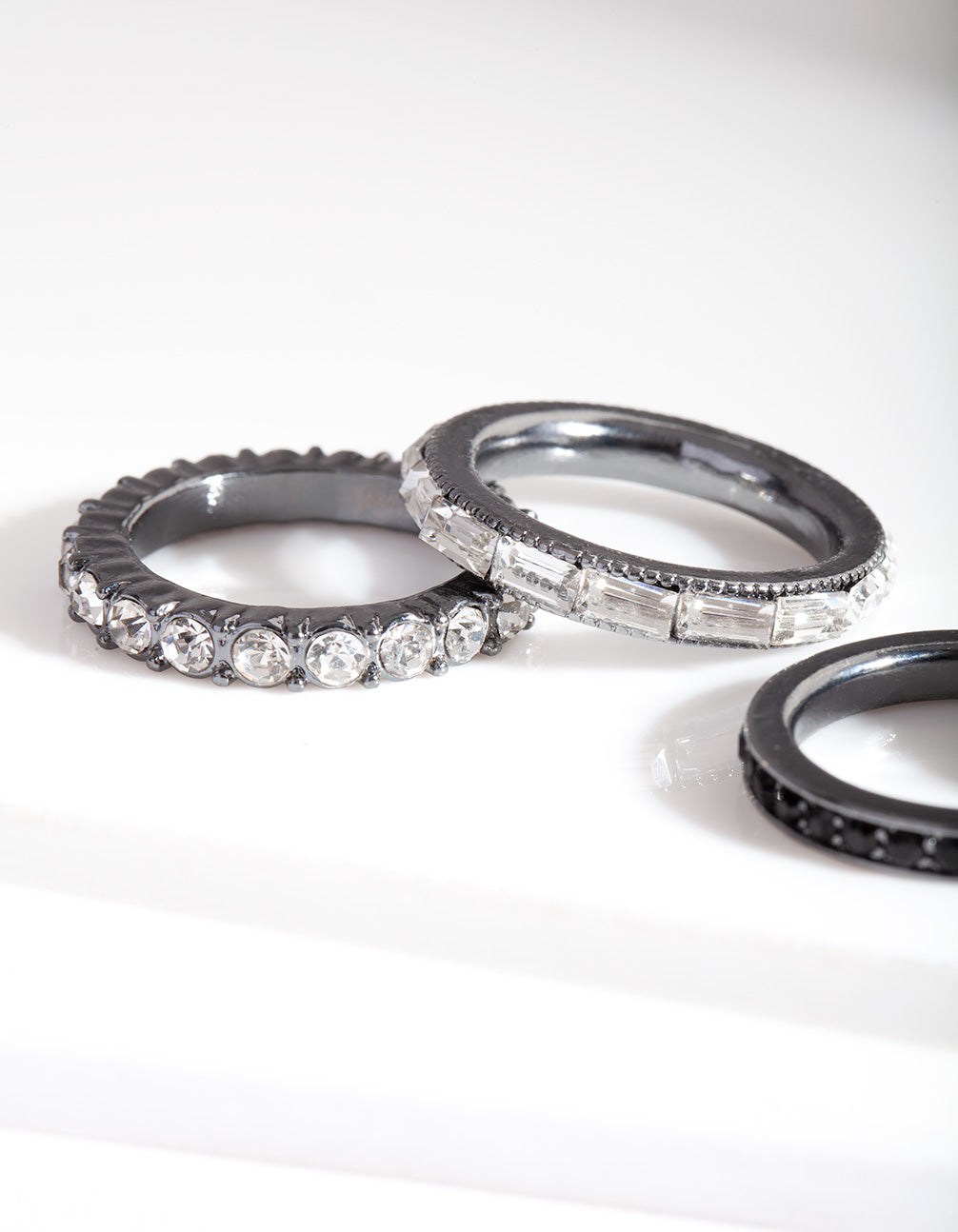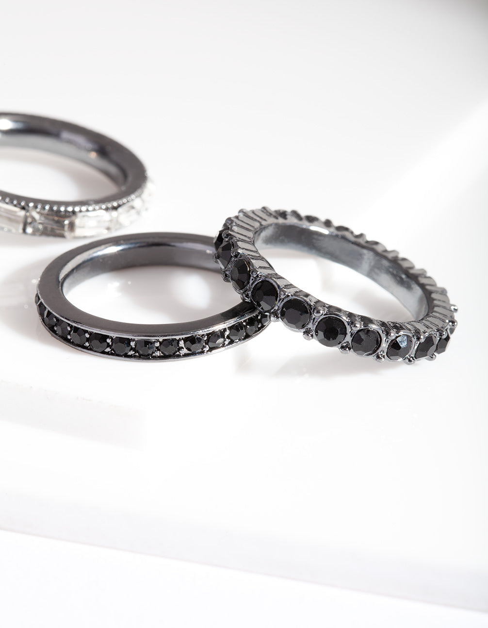 Ring stacking is a major trend. Ring packs allow you to mix and match to customise your look. This style features a gunmetal-toned setting with black diamantes.