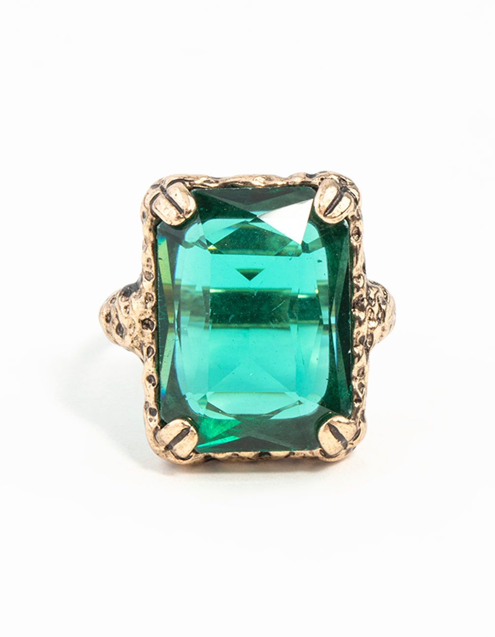 This 1920s-inspired ring features an emerald-coloured embellishment on a gold-toned setting.