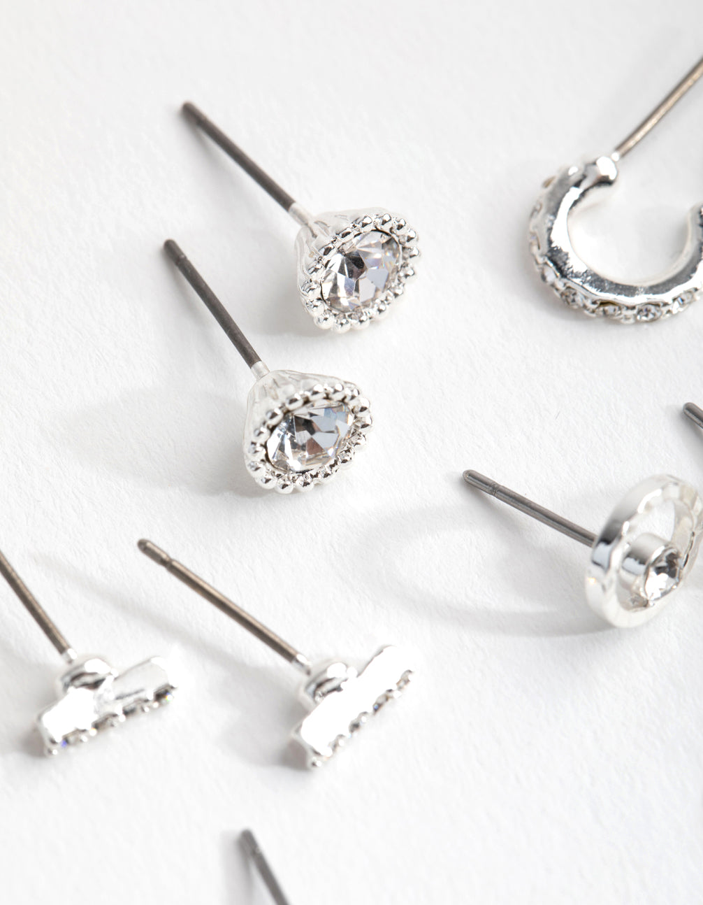 Mix them, match them, stack them! This earring pack is perfect for layering! It inclues eight silver-toned earrings with a variety of simple designs. Get them and get stacking!