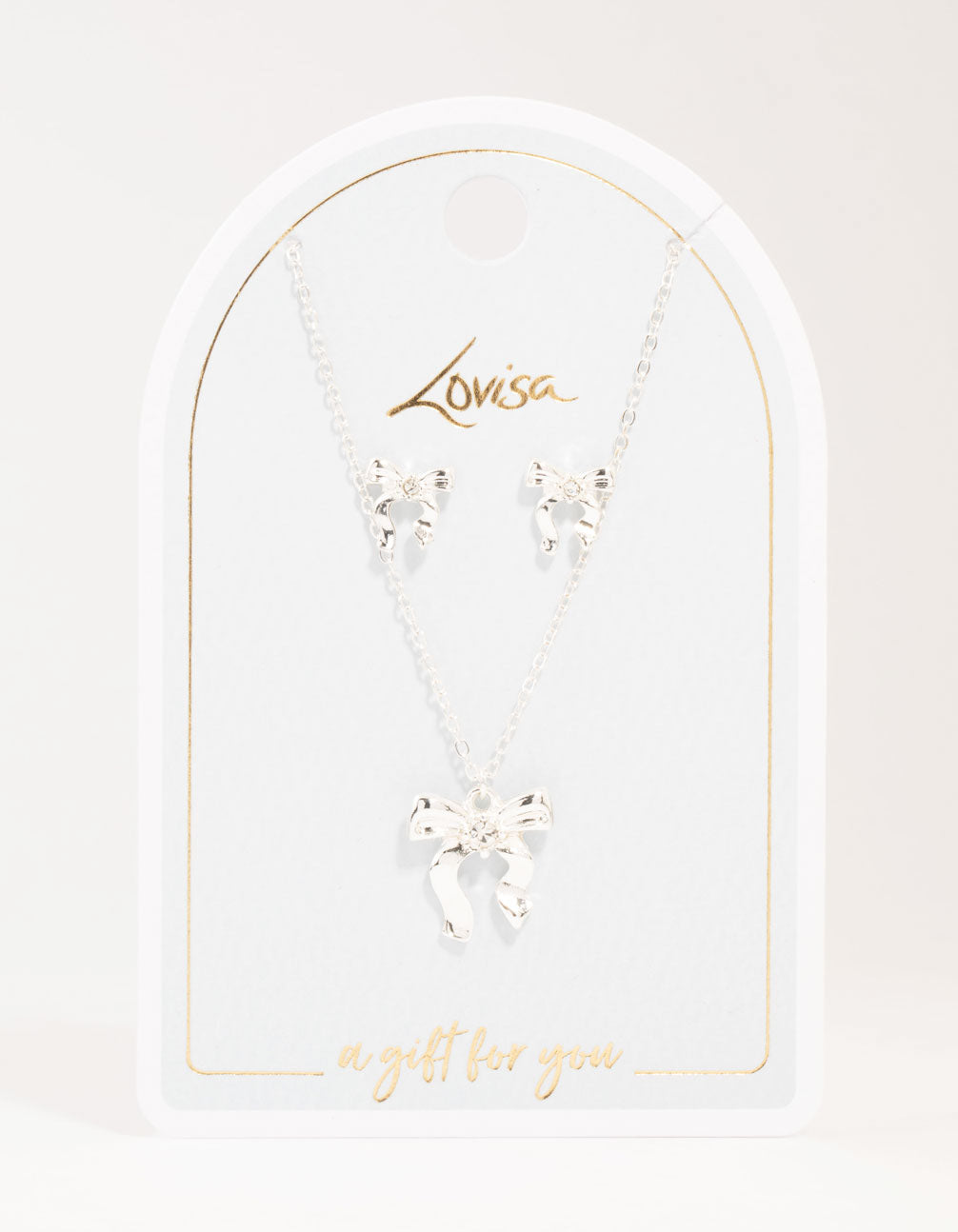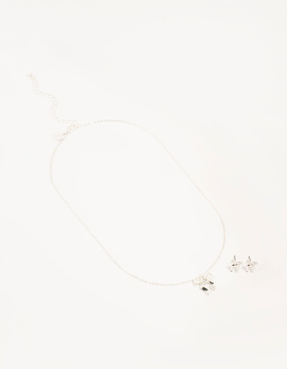 Give the gift of effortless glam with this silver toned set. This set features a coquettish silver bow necklace and earrings for a polished look.