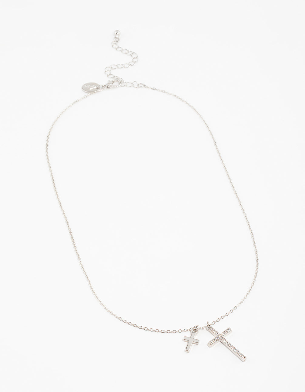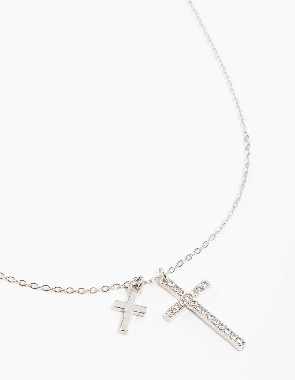 Add a touch of sparkle to your look with this chic silver-toned necklace! Featuring two cross charms—one dazzling with diamante crystals and the other sleek and shiny, this necklace is the perfect blend of elegance and flair.