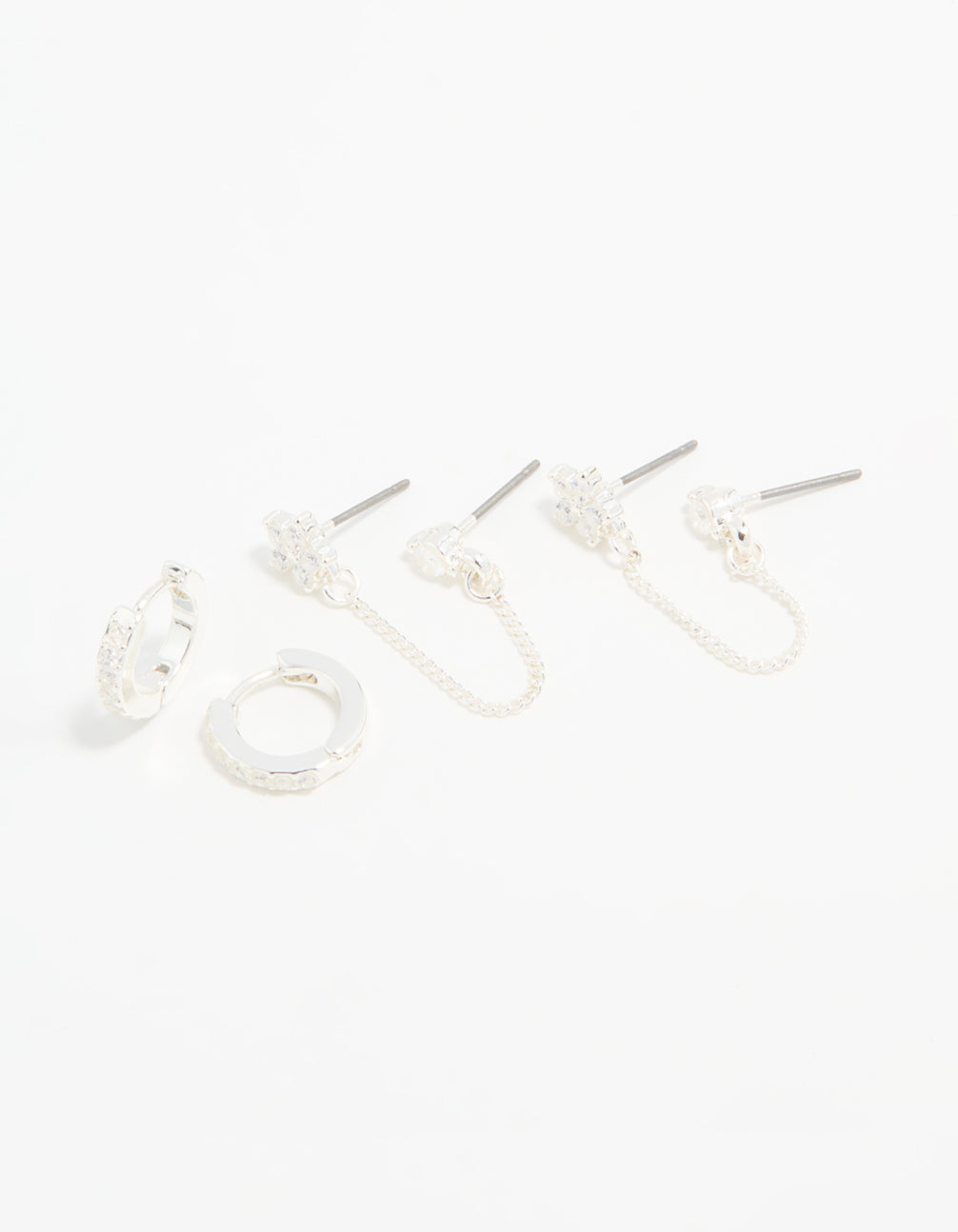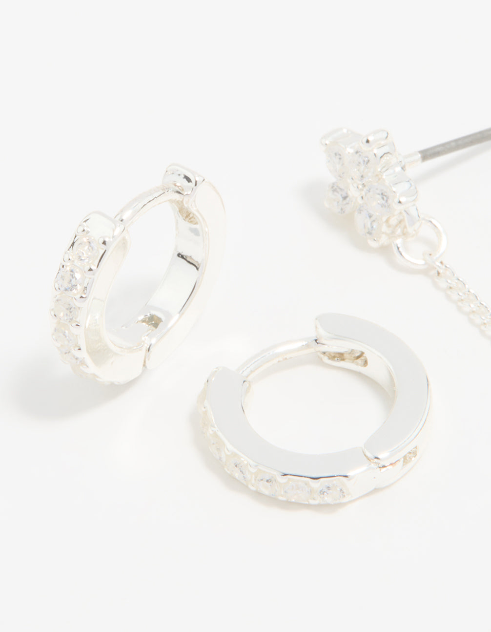 Silver Cubic Zirconia Chain Flower Chain & Huggie Earrings 3-Pack