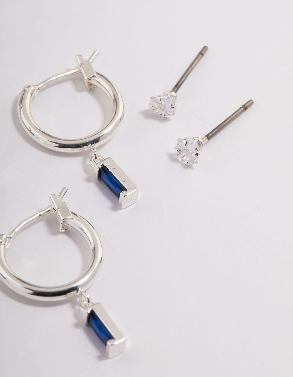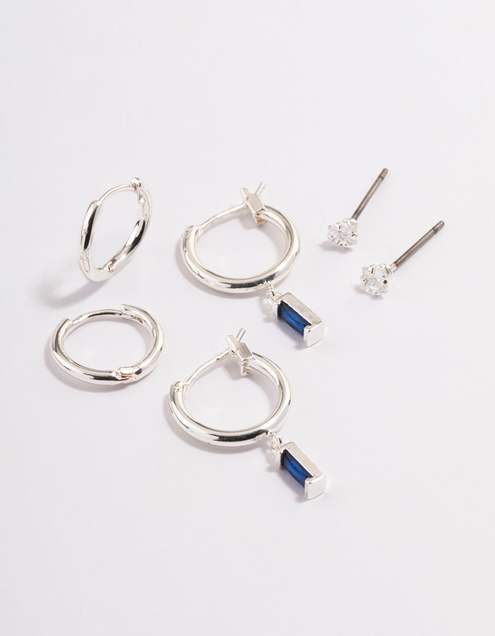 Dazzle with this set of six silver plated earrings including a pair of fun sapphire huggie earrings. This chic 6-pack blends contemporary style with timeless elegance, allowing you to mix and match for a personalised stack that shines from day to night.